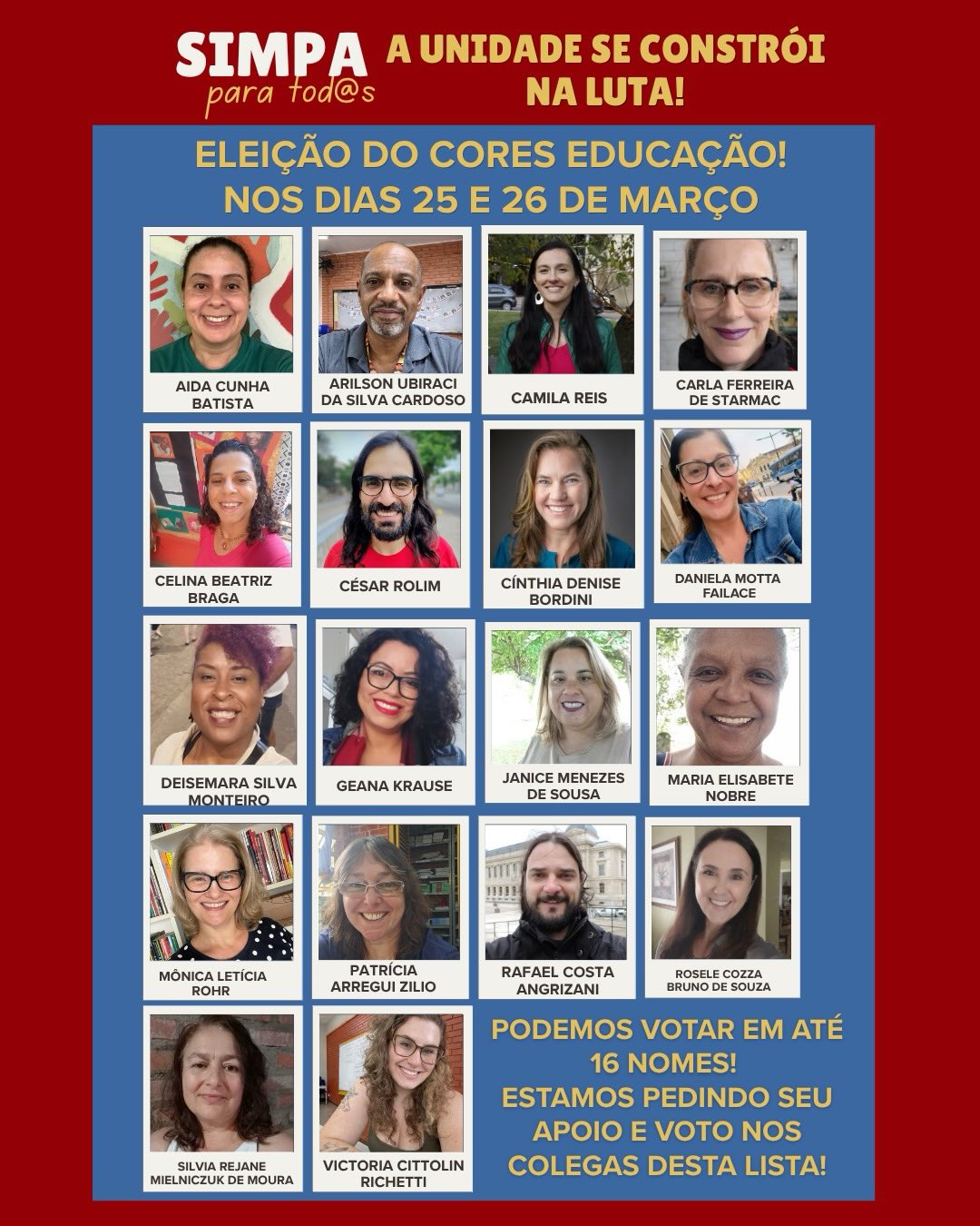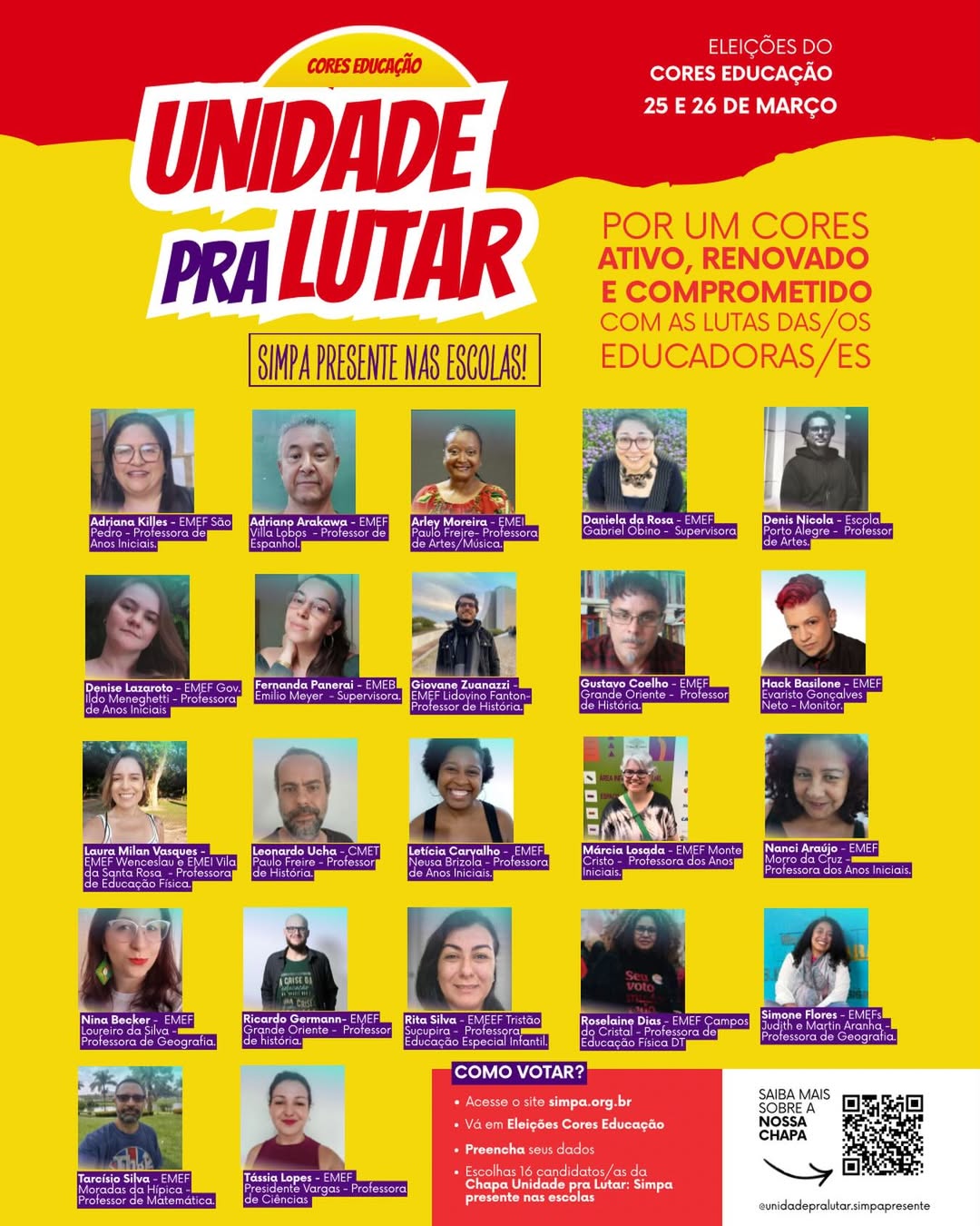 O Sindicato dos Municipários de Porto Alegre (Simpa) realiza, nesta semana, a eleição do CORES Educação, nos dias 25 e 26 de março, das 8h às 20h, em formato totalmente online. A votação é um momento fundamental de participação democrática da categoria, garantindo que os/as trabalhadores/as da educação elejam seus representantes para o próximo período.