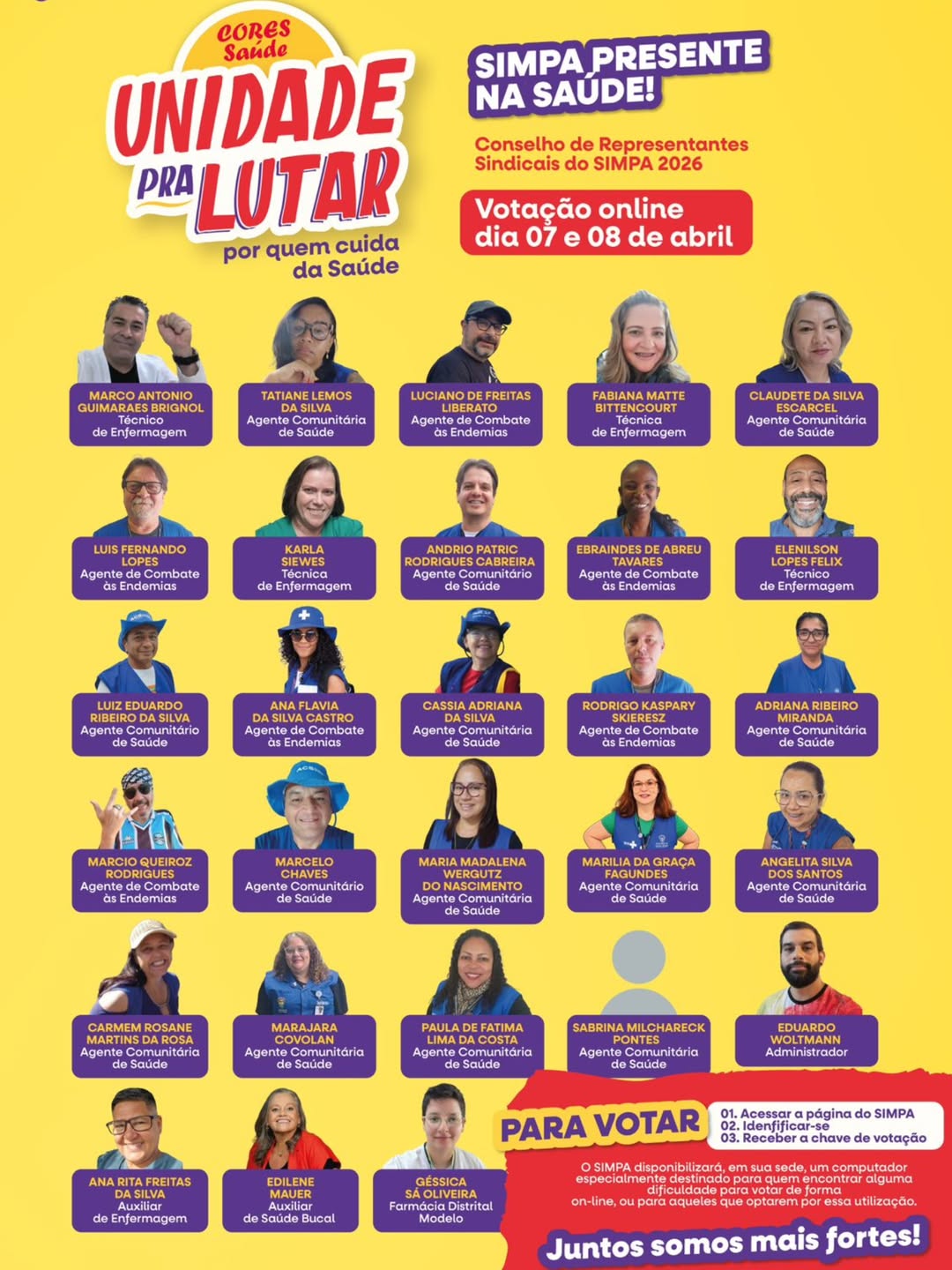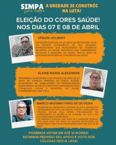 A Comissão Eleitoral das Eleições do CORES/Simpa realiza, nesta semana, a eleição do CORES Saúde, nos dias 7 e 8 de abril, das 8h às 20h, em formato totalmente online. A votação é um momento fundamental de participação democrática da categoria, garantindo que os/as trabalhadores/as da saúde elejam seus representantes para o próximo período.