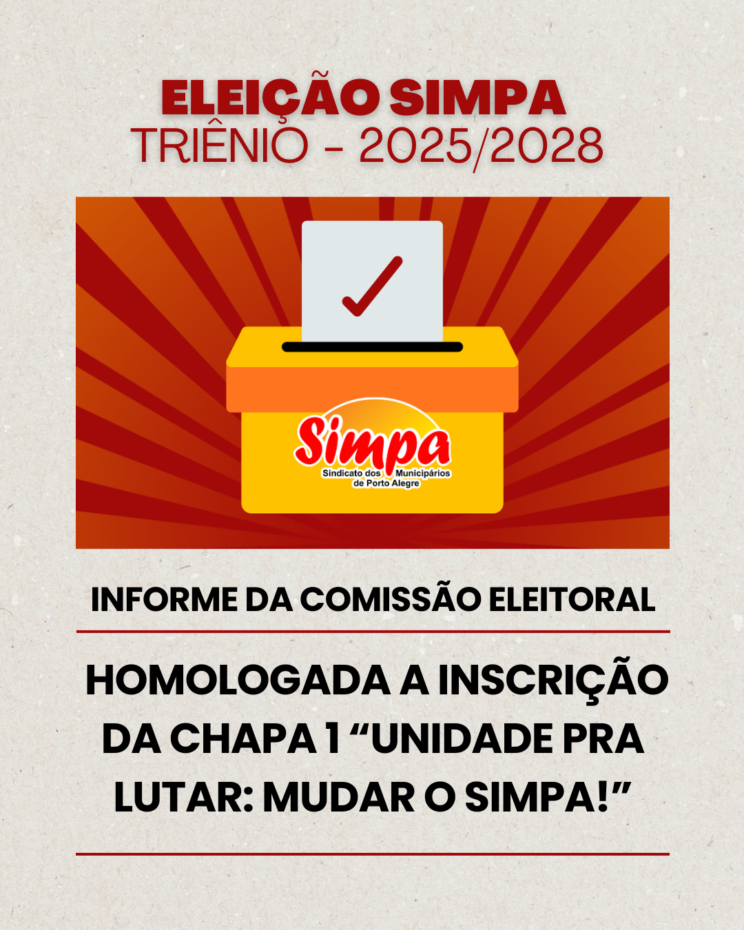 A Comissão Eleitoral do Sindicato dos Municipários de Porto Alegre (Simpa) homologou, no dia 3 de novembro, a Chapa 1 – Unidade pra Lutar: Mudar o Simpa!, que concorrerá à direção do Sindicato para o triênio 2025-2028. A homologação faz parte do processo eleitoral previsto no Regimento Eleitoral 2025, que normatiza a escolha da nova […]