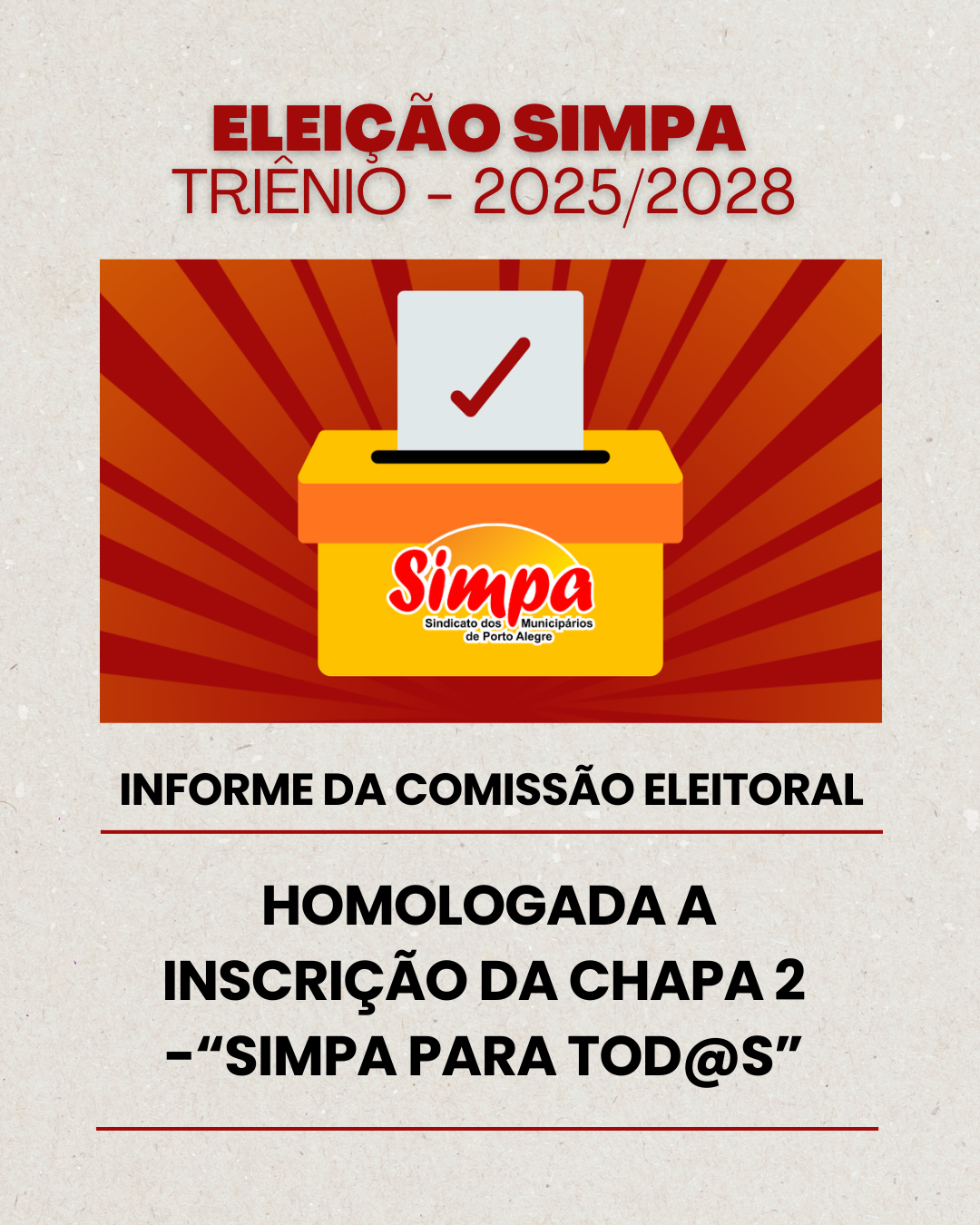 A Comissão Eleitoral do Sindicato dos Municipários de Porto Alegre (Simpa) homologou, no dia 7 de novembro, a Chapa 2 – SIMPA PARA TOD@S, que concorrerá à direção do Sindicato para o triênio 2025-2028. A homologação faz parte do processo eleitoral previsto no Regimento Eleitoral 2025, que normatiza a escolha da nova Diretoria do Simpa. […]