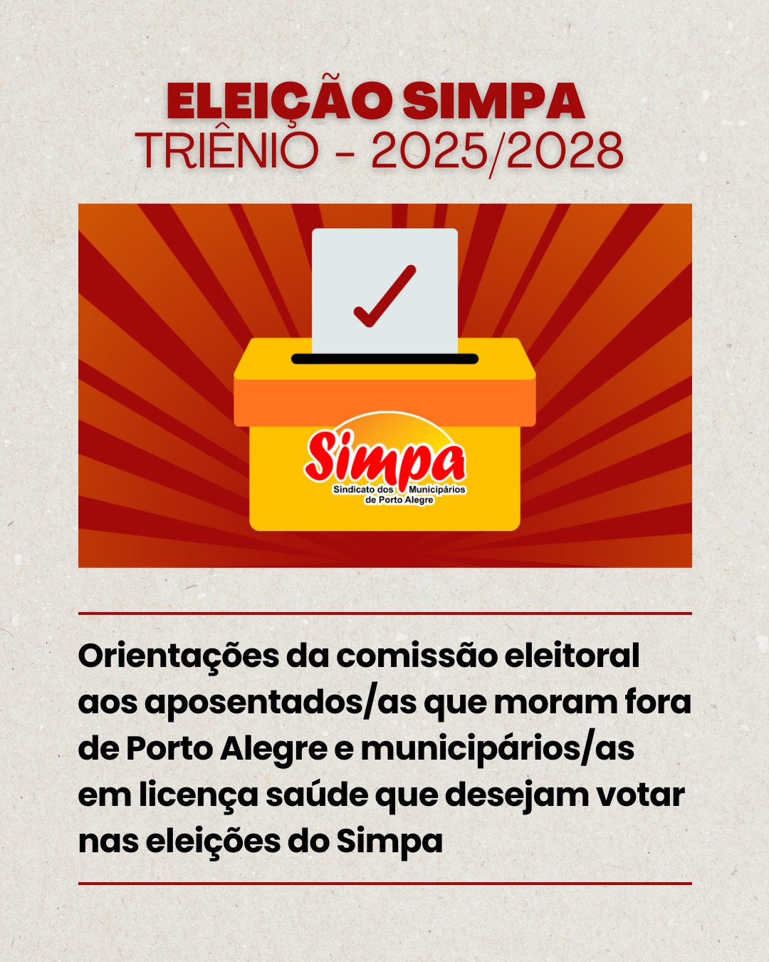 Edital de convocação da eleição do Simpa 2025 Edital publicado em jornal de grande circulação Regimento Eleitoral 2025 – Normatiza o processo eleitoral para a Diretoria do Sindicato dos Municipários de Porto Alegre (SIMPA) – Triênio 2025/2028