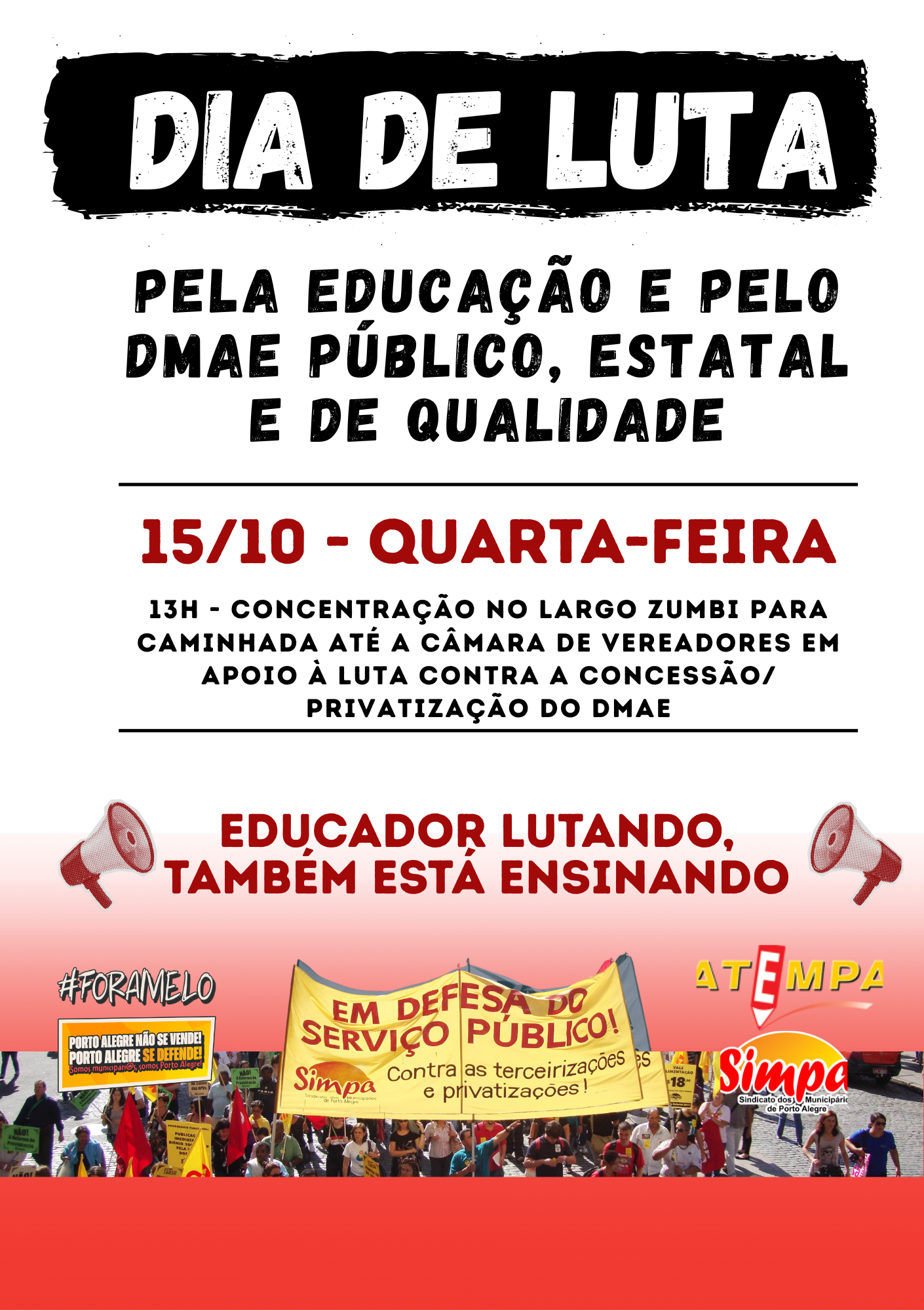 As educadoras e educadores de Porto Alegre se somam, neste 15 de outubro — Dia do Professor/a, à mobilização em defesa do serviço público e contra a privatização do DMAE. Nesta data, os vereadores/as da capital votarão o PLE 028/25, projeto do governo Sebastião Melo que autoriza a concessão/privatização do DMAE. É hora de dizer […]