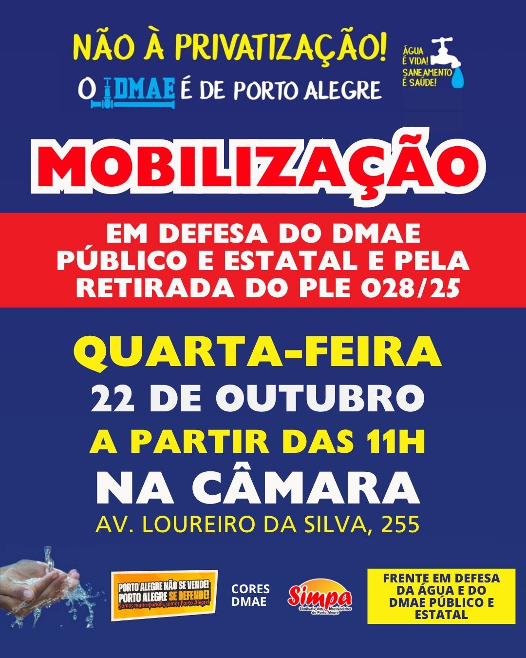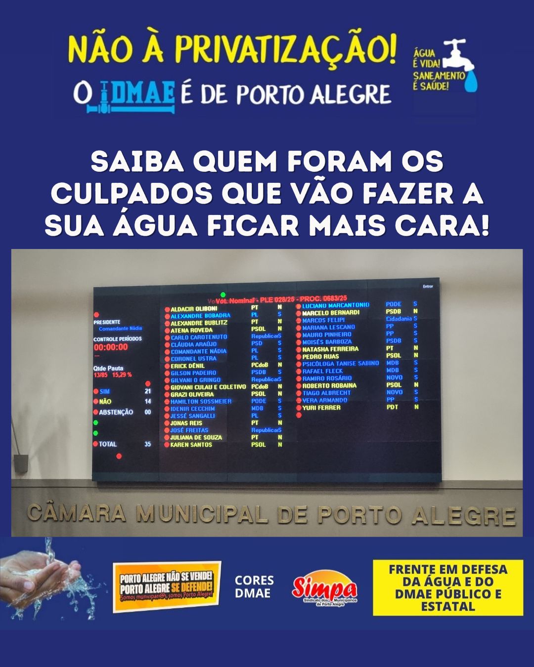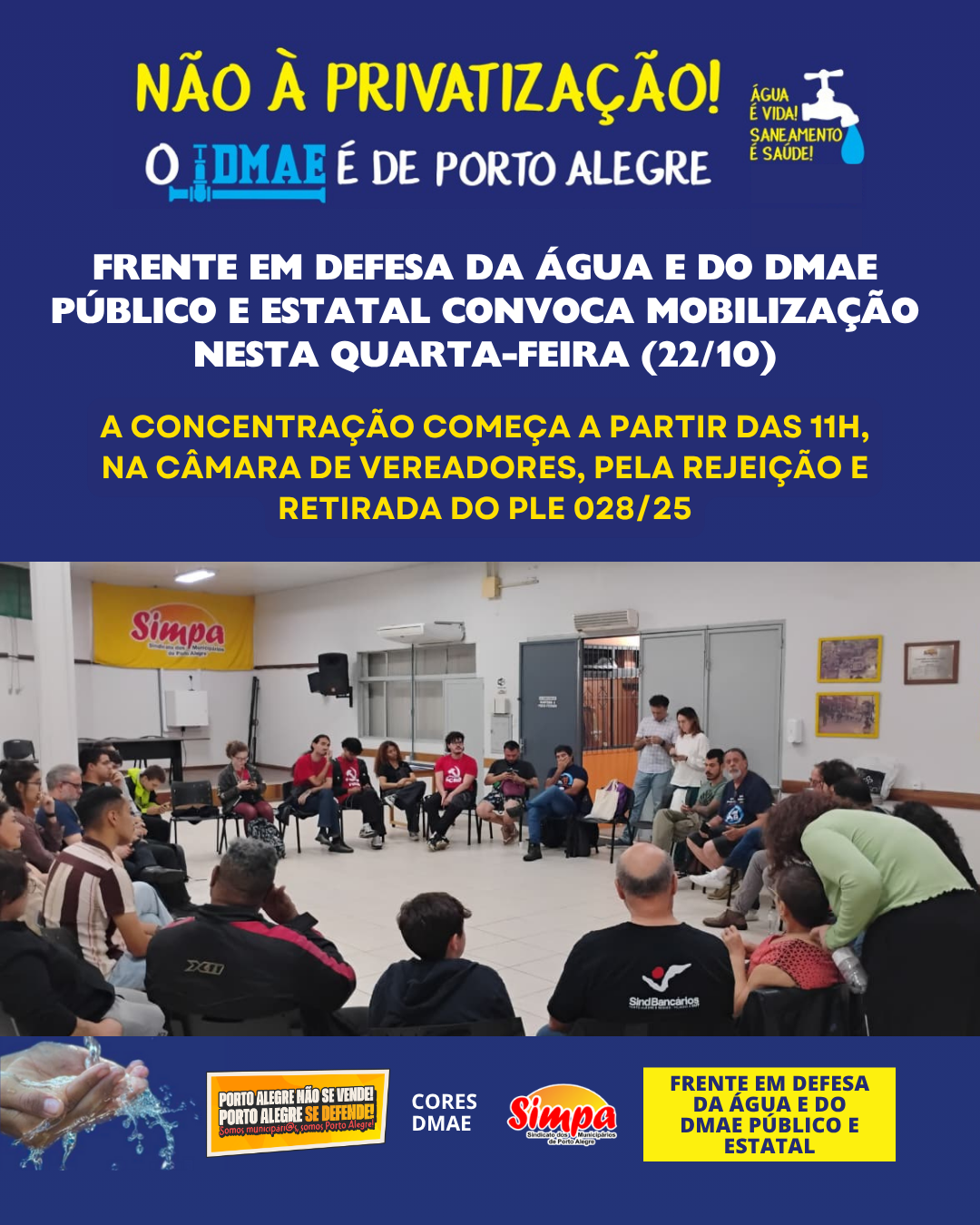 O PLE 028/25, que autoriza a concessão/privatização do DMAE, volta à pauta de votação na Câmara de Vereadores nesta quarta-feira (22/10). É hora de pressionar os vereadores e vereadoras pela rejeição e retirada do PLE, para que digam não à privatização do DMAE e à entrega do patrimônio de Porto Alegre a um monopólio privado. […]