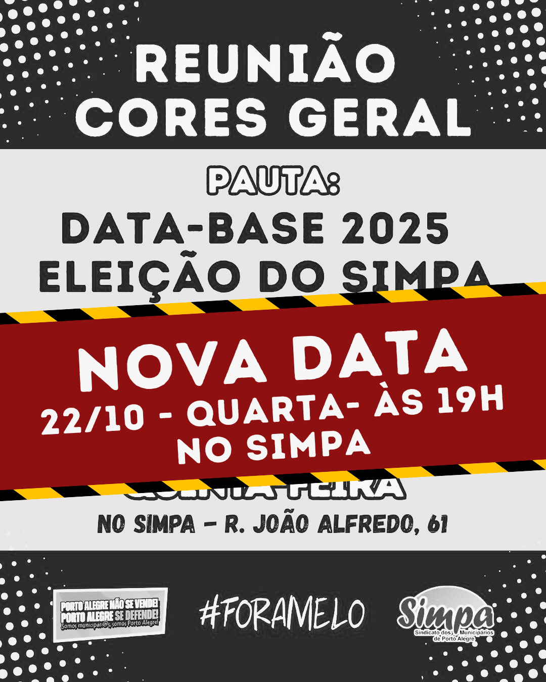 A reunião do Cores-Geral foi transferida para o dia 22 de outubro (quarta-feira), primeira chamada às 18h30, e segunda chamada às 19h, na sede do SIMPA. A pauta permanece a mesma: – Data-Base 2025 – Eleição do SIMPA Motivo da mudança: A alteração tem o objetivo de evitar o acúmulo de agendas para a categoria […]