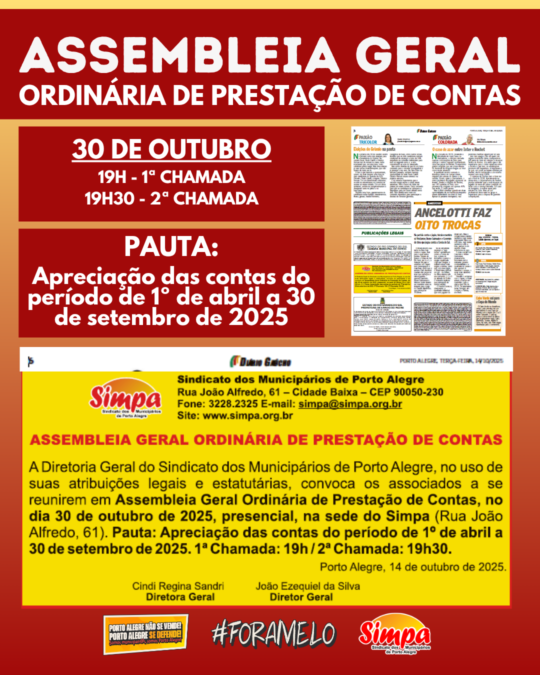Cumprindo com as determinações estatutárias, o Simpa publicou edital convocando Assembleia Geral Ordinária para prestação de contas do período de 1º de abril a 30 de setembro de 2025, que ocorrerá de forma presencial, no dia 30 de outubro, às 19h (primeira chamada) e 19h30 (em segunda chamada), na sede do Sindicato (Rua João Alfredo, […]