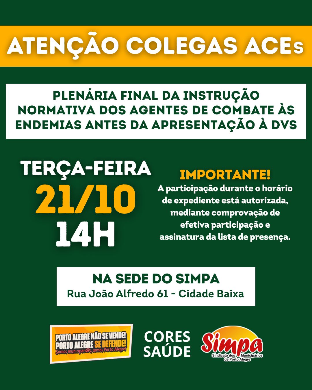 O Simpa e o Cores Saúde convocam todas e todos os ACEs para participarem da Plenária sobre a Instrução Normativa das atribuições dos agentes, que será realizada na terça-feira, dia 21 de outubro, às 14h, na sede do Simpa (Rua João Alfredo, 61 – Cidade Baixa). Importante: Atendendo solicitação do Simpa, e, por se tratar da […]