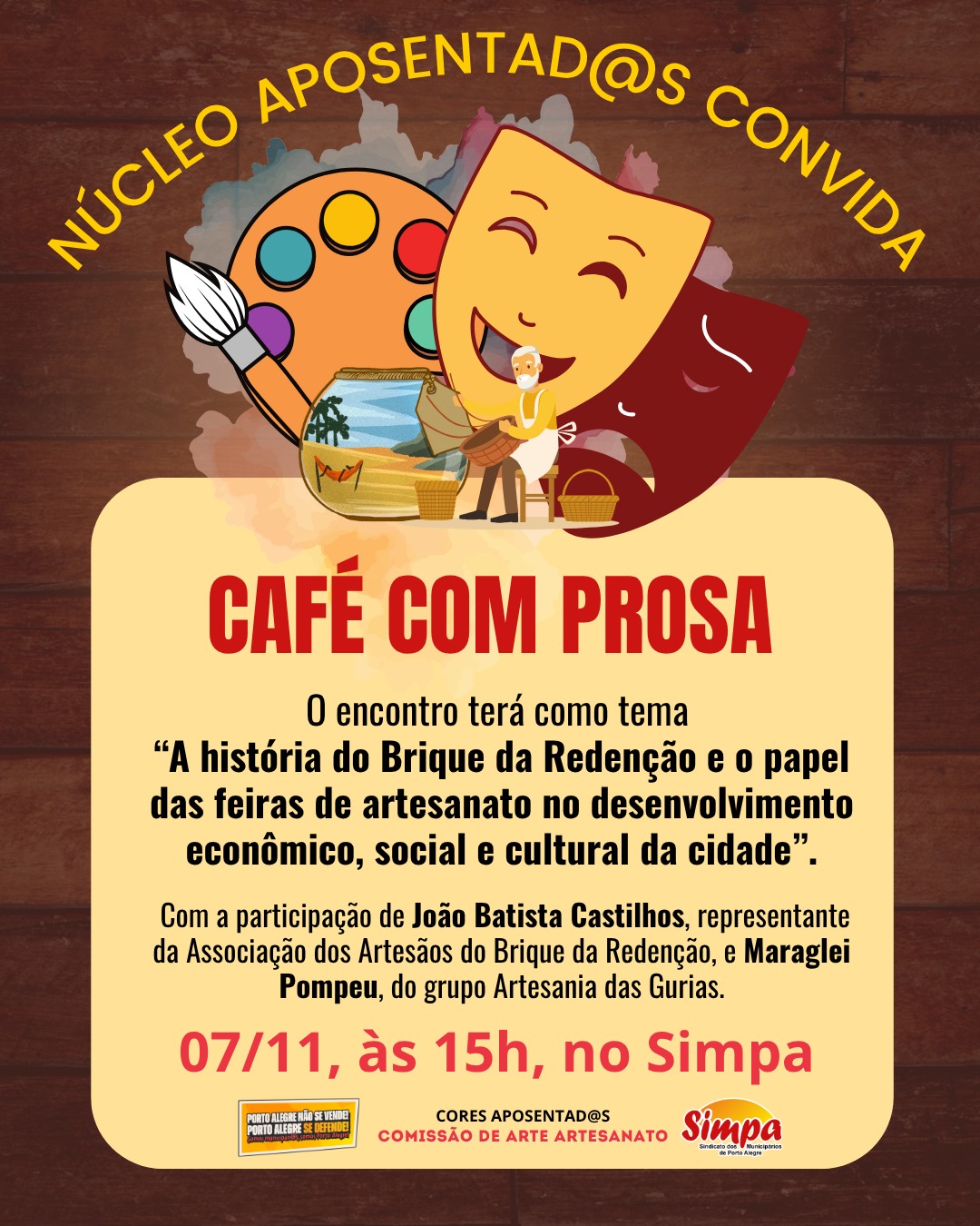 O Núcleo dos Aposentados do Sindicato dos Municipários de Porto Alegre (Simpa), por meio de sua Comissão de Arte e Artesanato, convida para mais uma edição do Café com Prosa, que acontece no dia 7 de novembro, às 15h, na sede do Simpa. Nesta edição, o encontro terá como tema “A história do Brique da […]