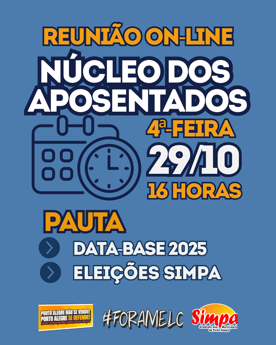 O Núcleo dos Aposentados do Simpa realiza, nesta quarta-feira (29/10), uma reunião on-line a partir das 16 horas. O encontro abordará dois temas centrais: data-base 2025 e eleições do Simpa. Para participar, acesse o link: https://meet.google.com/few-snwj-fwr?authuser=0 Participe! Fortaleça o Simpa e a luta dos municipários e municipárias aposentados de Porto Alegre. Porto Alegre não se […]