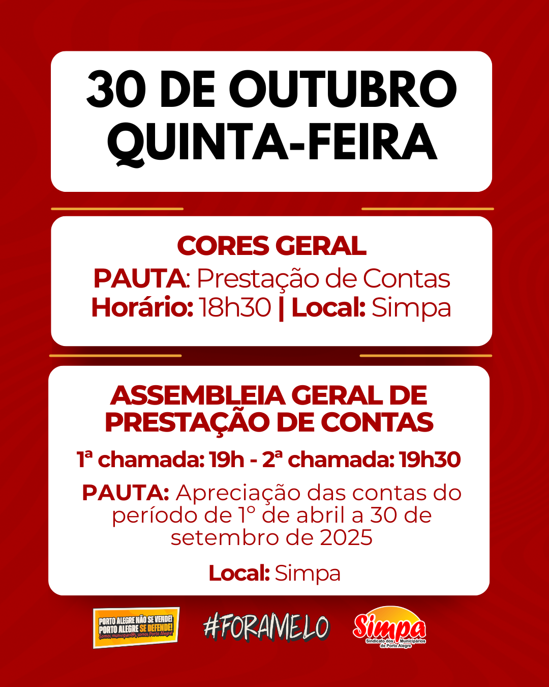 Cumprindo as determinações estatutárias, o Simpa convoca Assembleia Geral Ordinária para prestação de contas do período de 1º de abril a 30 de setembro de 2025. A assembleia será presencial, no dia 30 de outubro, às 19h (primeira chamada) e 19h30 (segunda chamada), na sede do Sindicato (Rua João Alfredo, 61 – Cidade Baixa). Antes […]