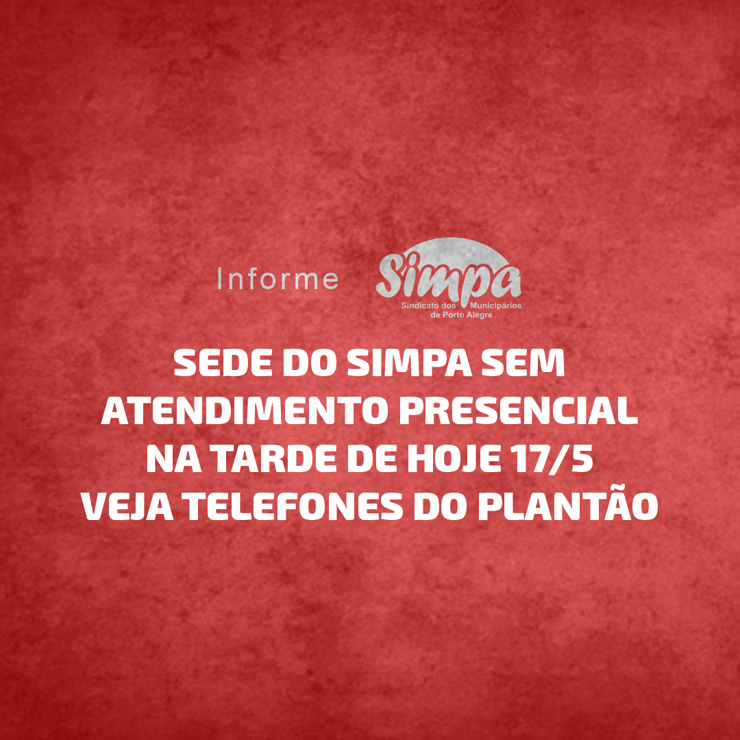 A direção do Sindicato dos Municipários de Porto Alegre informa que a sede do Sindicato estará fechada para atendimento ao público no período da tarde desta terça-feira (17/5), em virtude do alerta emitido pela Defesa Civil, de condições climáticas adversas, com rajadas de vento entre 60 e 100 quilômetros por hora. O atendimento será […]
