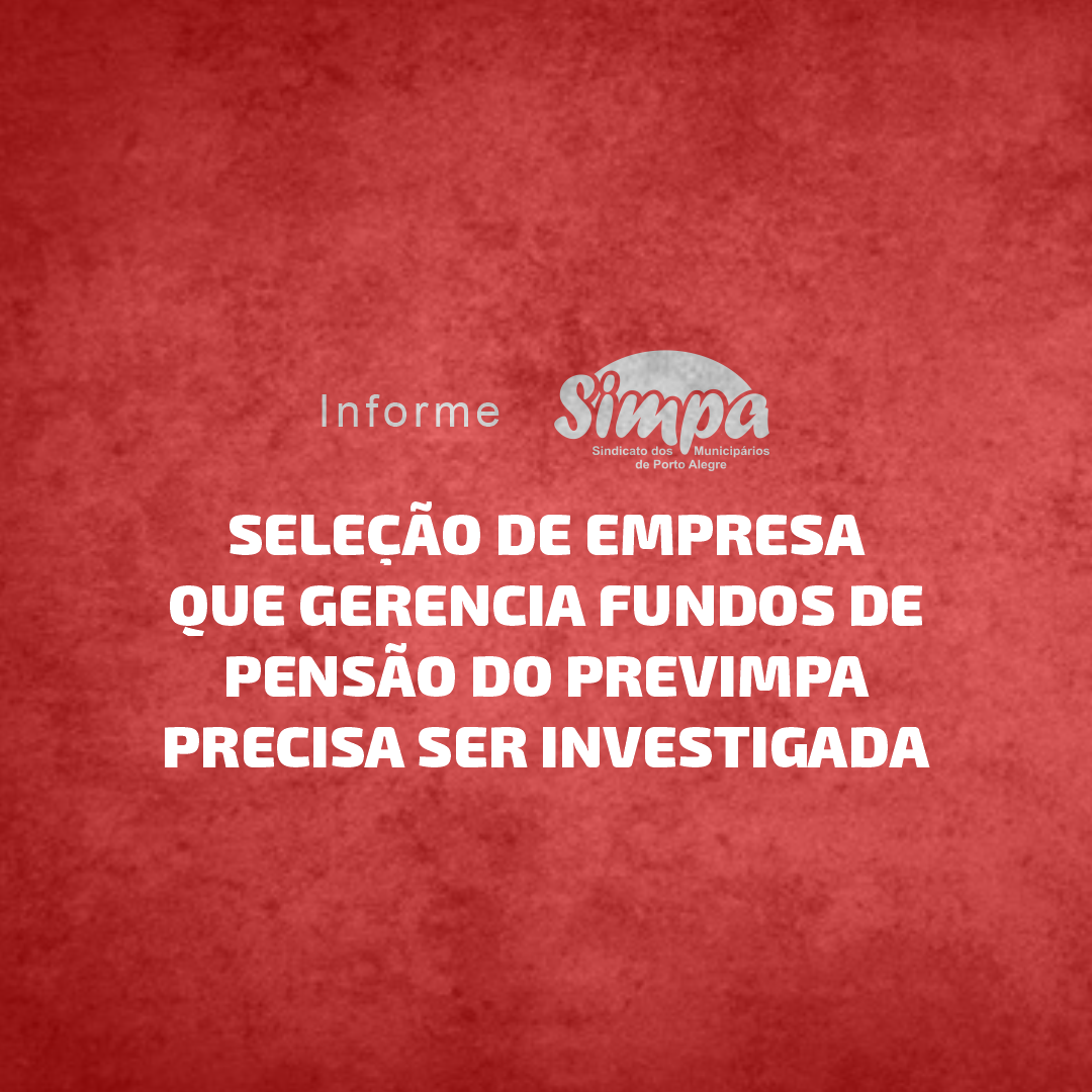 O Sindicato dos Municipários de Porto Alegre (Simpa) entrou com uma representação no Ministério Público do RS, nessa segunda-feira (11/4), por possível ato de improbidade administrava contra o ex-diretor geral do Previmpa, Rodrigo Machado Costa, a Icatu Serviços de Administração Previdenciária LTDA e a Grid Agente Autônomo de Investimentos LTDA. O sindicato pede que se […]