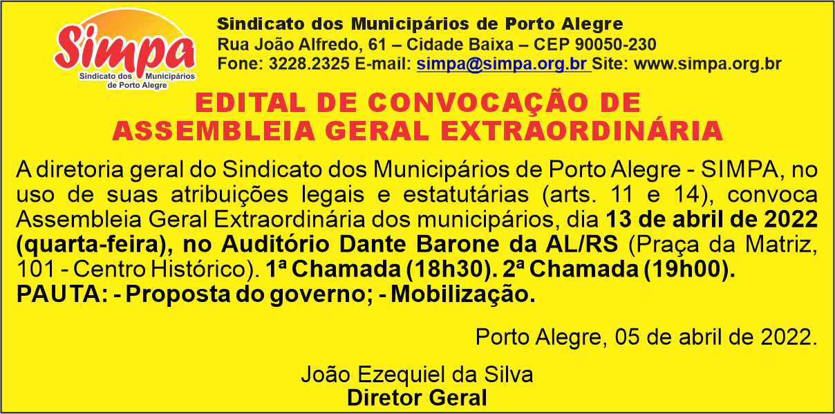 Confira a publicação do edital que convoca a Assembleia Geral Extraordinária da Categoria Municipária, publicado no Diário Gaúcho, edição do dia 08/04/2022, página 25. ASSEMBLEIA GERAL EXTRAORDINÁRIA PRESENCIAL 13/04/2022 – 18h30 (1ª chamada) 19h (2ª chamada), no Auditório Dante Barone da AL/RS (Praça da Matriz, 101 – Centro Histórico) Pauta: Proposta do governo; Mobilização. AGE […]