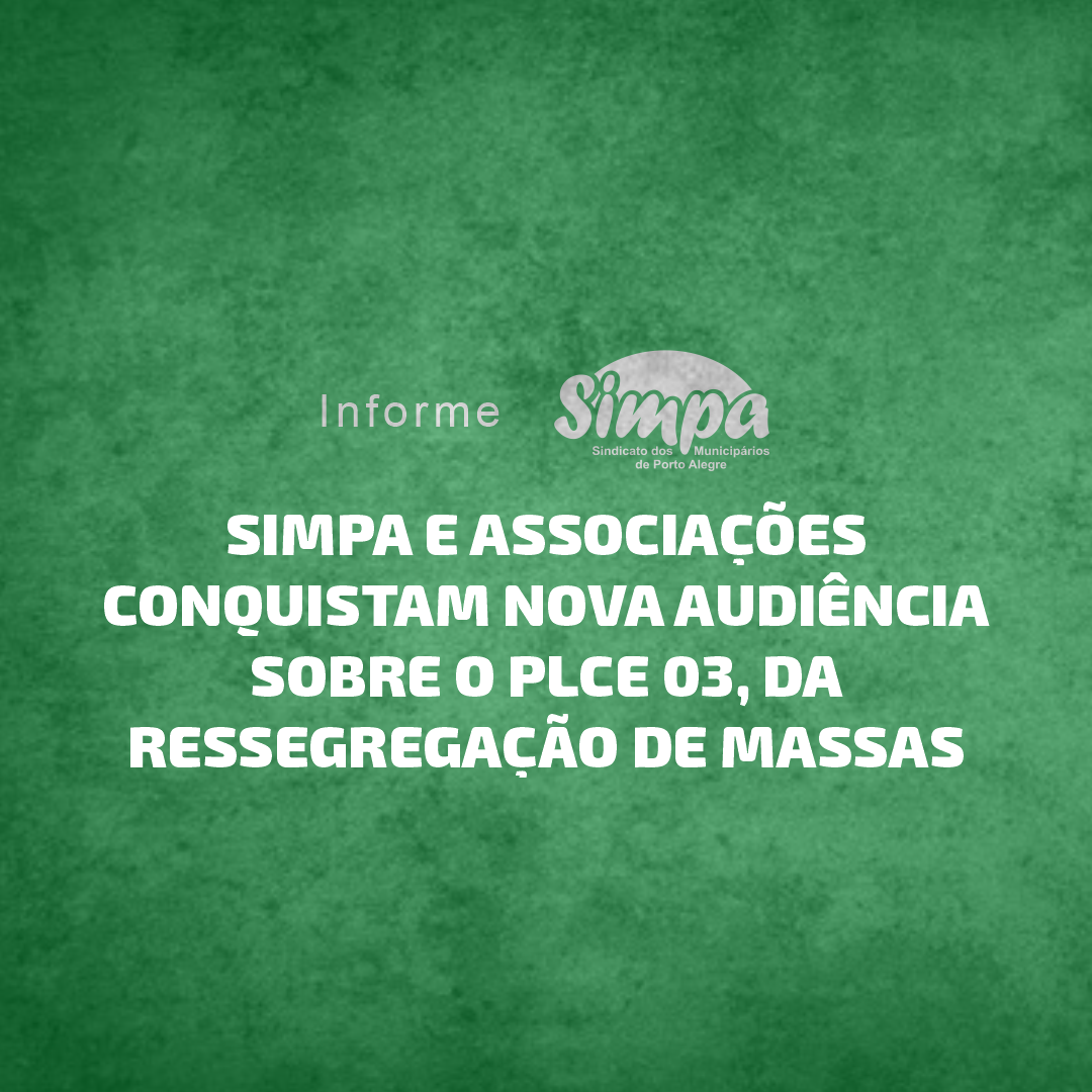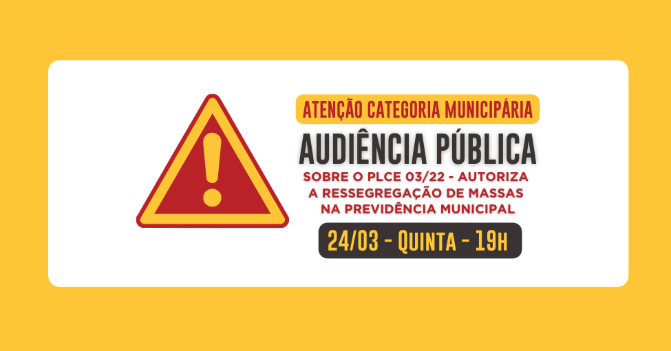 O Simpa chama a categoria municipária a participar da audiência pública da Câmara Municipal de Porto Alegre, que acontece nesta quinta-feira, 24/03, às 19h, sobre o PLCE 03/22 – que autoriza a ressegregação de massas do sistema previdenciário municipal, causando enorme prejuízo às servidoras e servidores públicos da Prefeitura de Porto Alegre. >> Conforme publicação […]