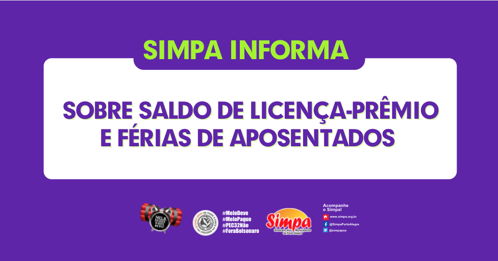O Simpa informa que as municipárias e municipários de Porto Alegre aposentados desde 2017, que ficaram com saldo de licença-prêmio e férias, têm o direito de receber estes benefícios de forma indenizada. Se você se enquadra nesta situação, entre em contato com o Simpa, de segunda a sexta-feira, das 13h às 17h30, pelos canais: […]