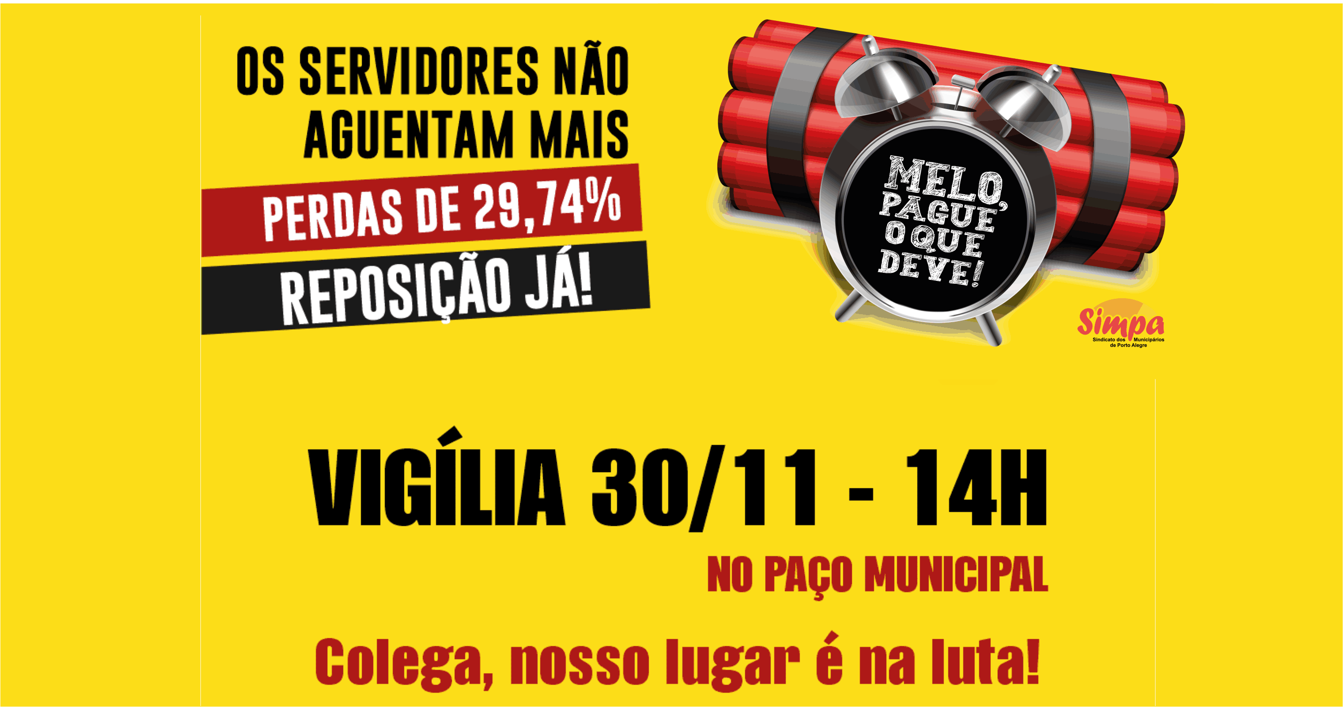 O Simpa chama a categoria municipária para vigília na próxima terça-feira (30), a partir das 14h, no Paço Municipal, quando o Simpa estará novamente reunido com a Comissão de Negociação da prefeitura tratando das reivindicações da categoria. O objetivo do ato é pressionar o prefeito Sebastião Melo pela reposição da inflação, que não é paga […]