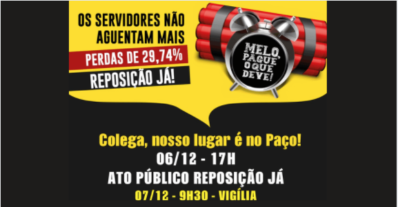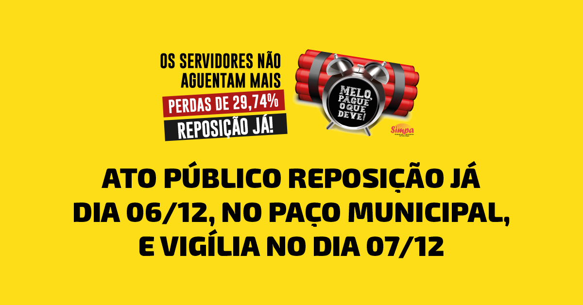 Dias 6 e 7 é mobilização total pela reposição já! Avise colegas, participe dos atos e fique atento às redes do Simpa! Compartilhe as publicações que o sindicato fizer para pressionarmos Melo em defesa dos nossos direitos! Leia também: Cores Simpa delibera atividades de luta, com Ato Público dia 06/12 Municipários […]