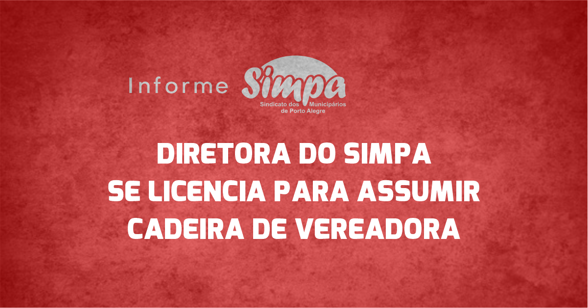 O Simpa comunica a categoria municipária que a diretora administrativa do Simpa, Luciane Pereira, estará licenciada do cargo entre os dias 27 e 29 de outubro. Suplente do PCdoB, neste período Luciane atuará como vereadora juntamente com o Coletivo Cuca Congo. A chegada de Luciane à Câmara de Municipal de Porto Alegre marca um […]
