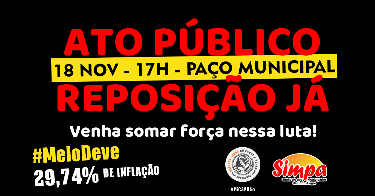Com o objetivo de dar continuidade à luta em defesa da reposição inflacionária de 29,74% sobre os salários dos servidores públicos municipais de Porto Alegre, o Simpa realizará novo ato público no dia 18 de novembro, a partir das 17h, no Paço Municipal. A categoria, que está há cinco anos e meio sem correção […]