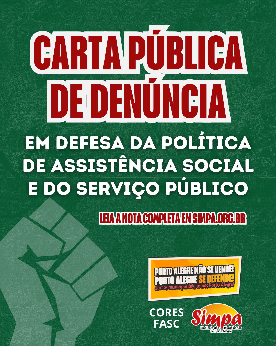 O SIMPA recebeu nos últimos dias diversos relatos de trabalhadores e trabalhadoras da política de assistência social do município de Porto Alegre e vem a público denunciar uma possível e grave irregularidade que pode comprometer diretamente a Política de Assistência Social do Município de Porto Alegre se confirmada, atingindo tanto os trabalhadores do Sistema Único […]