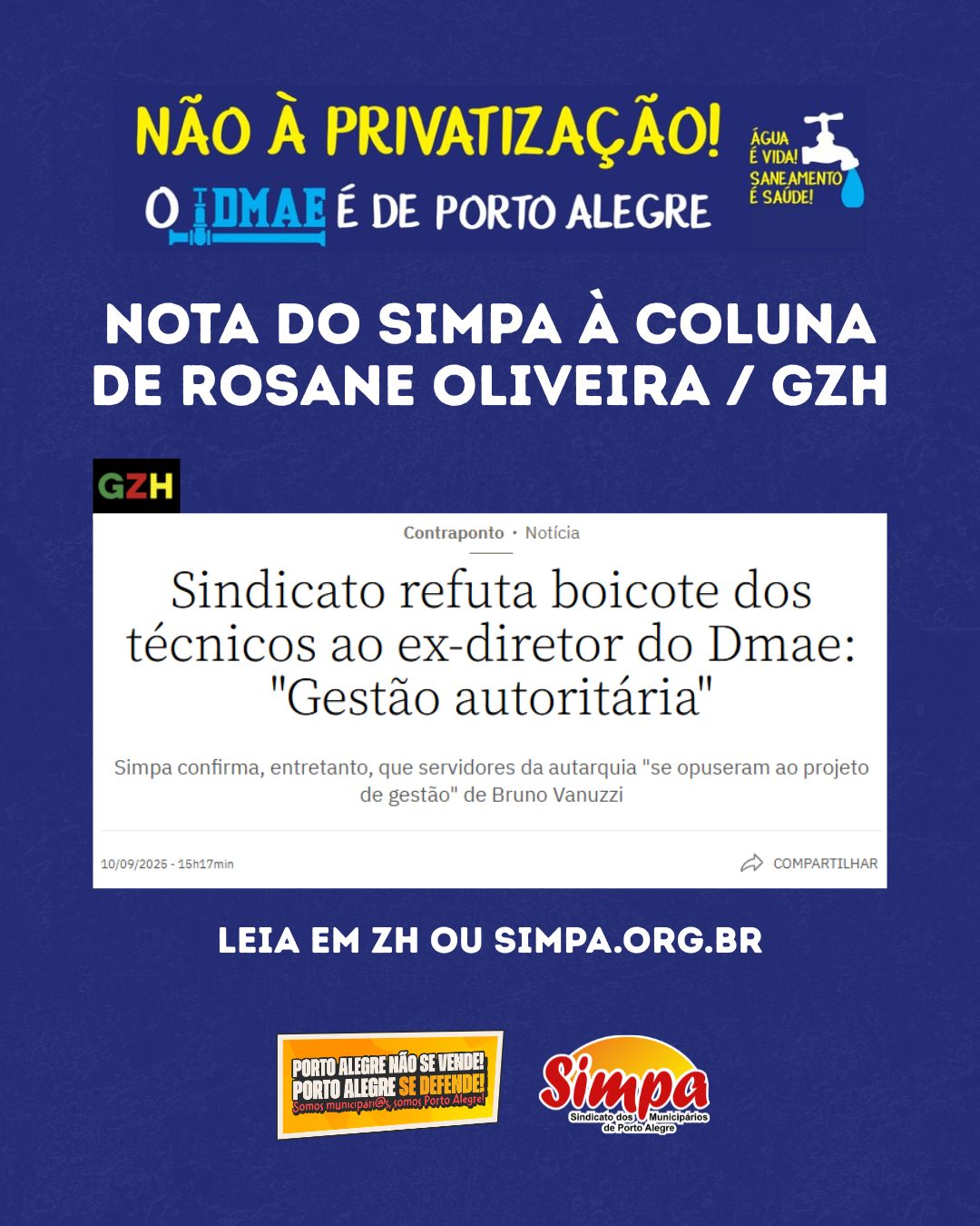 *Conteúdo publicado originalmente em 10/09/2025 na Coluna de Rosane de Oliveira na GZH (Zero Hora) O Sindicato dos Municipários de Porto Alegre (Simpa) refutou a existência de um boicote por parte dos técnicos do Dmae ao agora ex-diretor da autarquia Bruno Vanuzzi. Ele deixou o cargo na última sexta-feira (5), justificando querer dedicar mais tempo […]