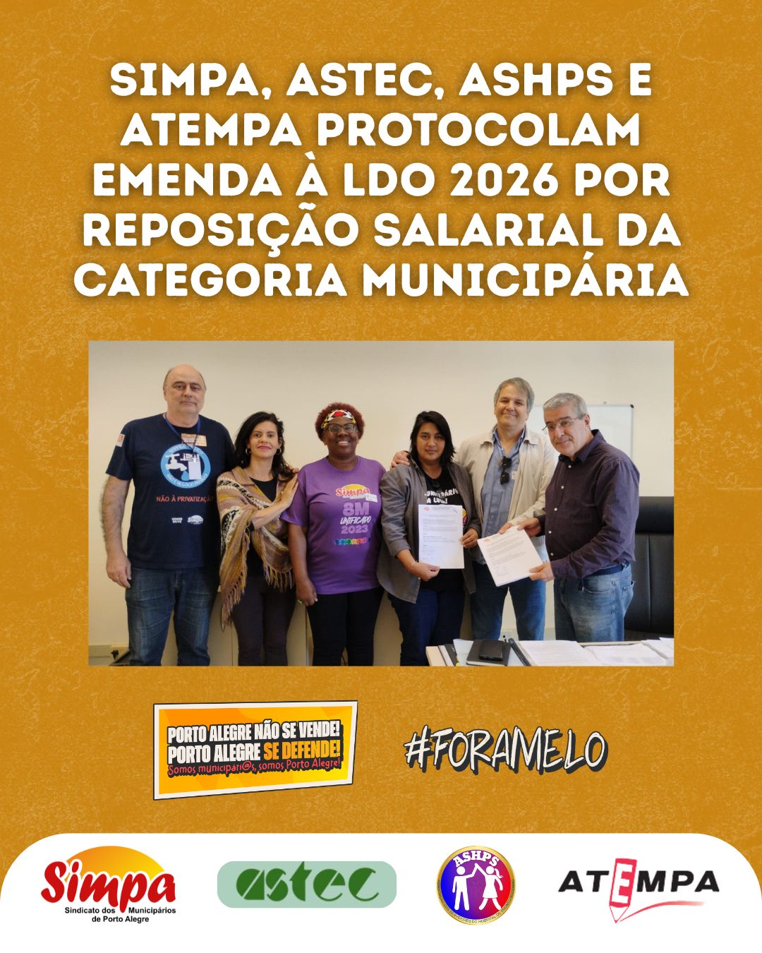 Na tarde desta quinta-feira (11/09), o Simpa, em conjunto com as associações Astec, Ashps e Atempa, protocolou na Câmara Municipal de Porto Alegre uma emenda ao Projeto de Lei do Executivo nº 045/25 (LDO 2026), que trata das diretrizes orçamentárias do próximo ano. O documento foi entregue ao Diretor Legislativo Luis Afonso. Participaram os diretores […]