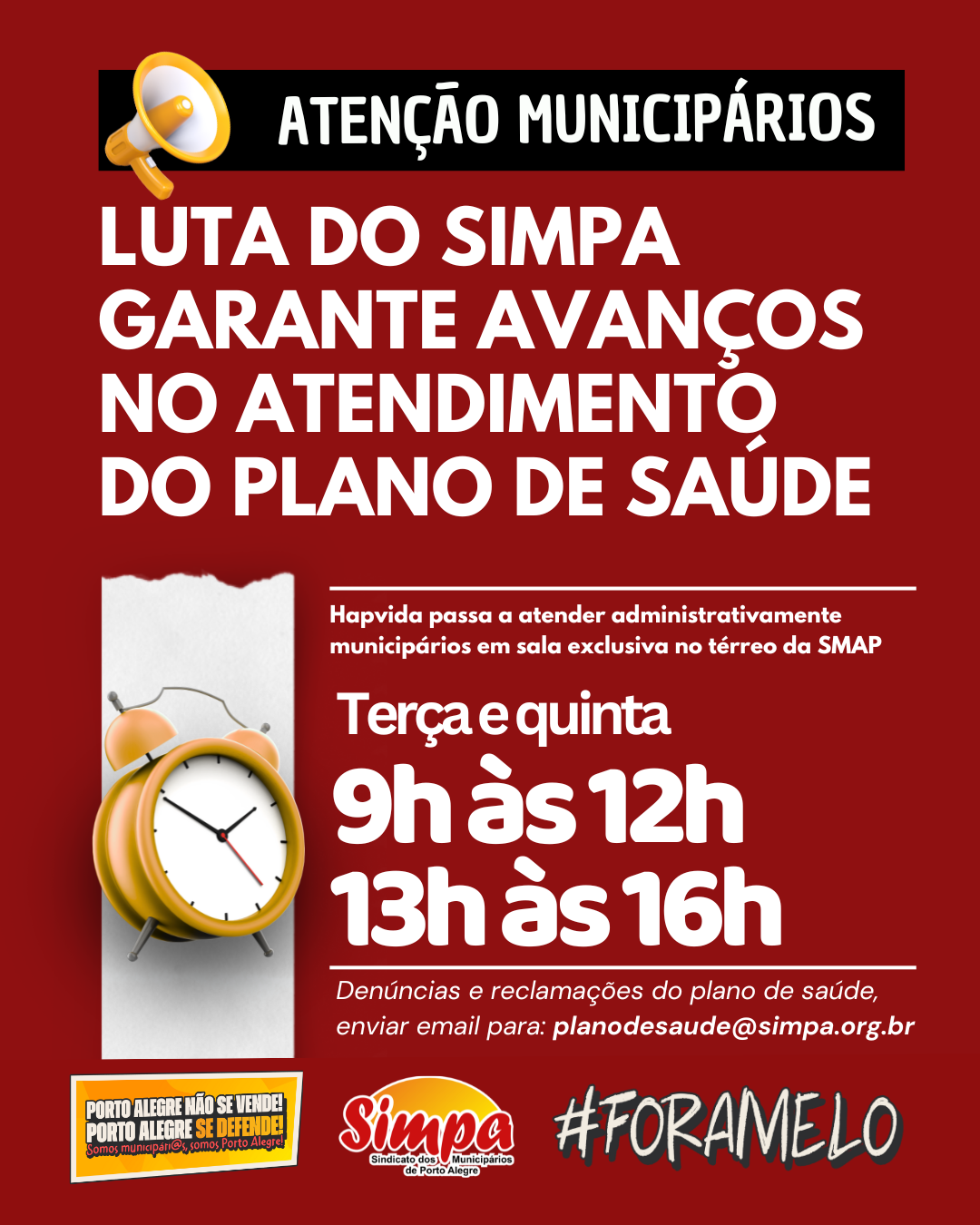 A pressão e a luta do Sindicato dos Municipários de Porto Alegre (Simpa), diante das inúmeras denúncias e reclamações feitas pelos municipários sobre o atendimento do plano de saúde Hapvida, resultaram em avanços importantes para a categoria. A mobilização garantiu que a sala de atendimento do plano de saúde — que antes funcionava no 8º […]