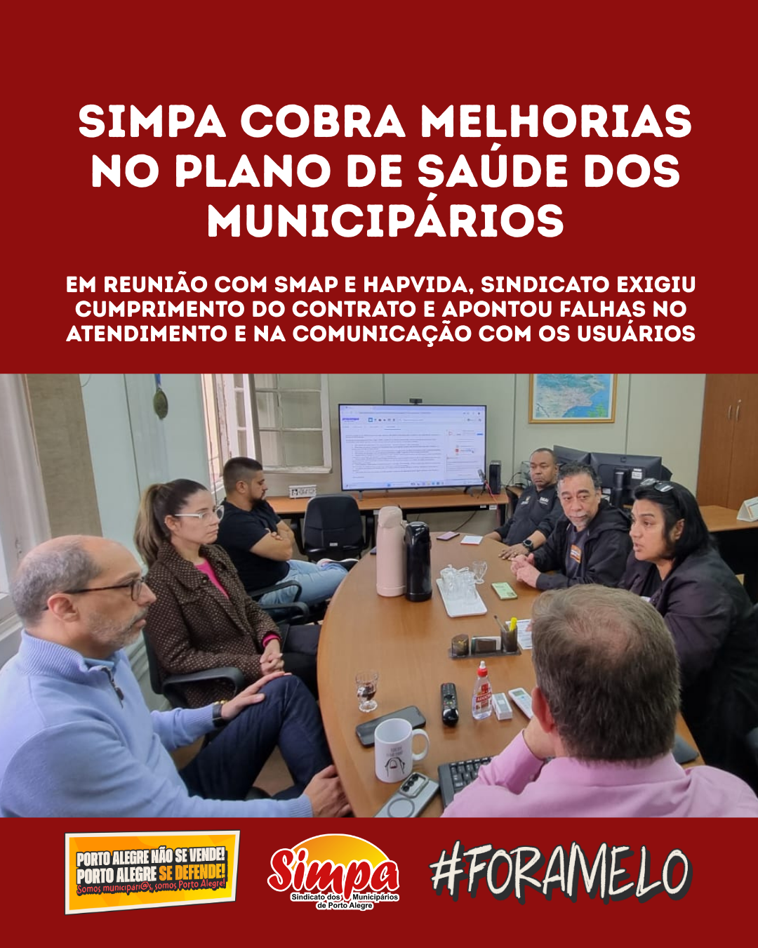 O Sindicato dos Municipários de Porto Alegre (SIMPA) participou de mais uma reunião, na manhã desta quinta-feira (04/09), com a Secretaria Municipal de Administração e Patrimônio (SMAP) e representantes da operadora Hapvida, com o objetivo de discutir a situação do contrato de assistência à saúde dos servidores municipais. O contrato foi renovado de forma emergencial […]