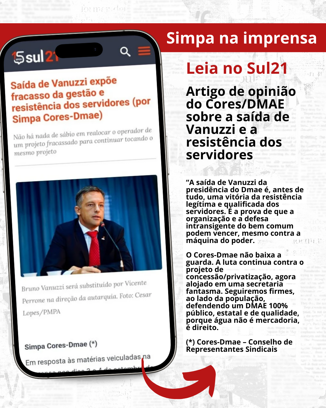 Confira o artigo do Simpa/CORES-DMAE, publicado no Sul21 nesta sexta-feira (05/09), sobre a saída de Bruno Vanuzzi da presidência do DMAE, que evidencia o fracasso de sua gestão e a resistência dos servidores municipais. Saída de Vanuzzi expõe fracasso da gestão e resistência dos servidores (por Simpa Cores-Dmae) Não há nada de sábio em […]