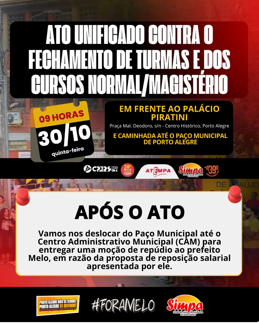 Nesta quinta-feira (30/10), a partir das 9h, o Simpa participa do Ato Unificado contra o fechamento de turmas e dos cursos Normal/Magistério, em frente ao Palácio Piratini, na Praça Mal. Deodoro, no Centro Histórico de Porto Alegre. Na sequência, haverá caminhada até o Paço Municipal. Após a atividade, os municipários se deslocam até o Centro […]