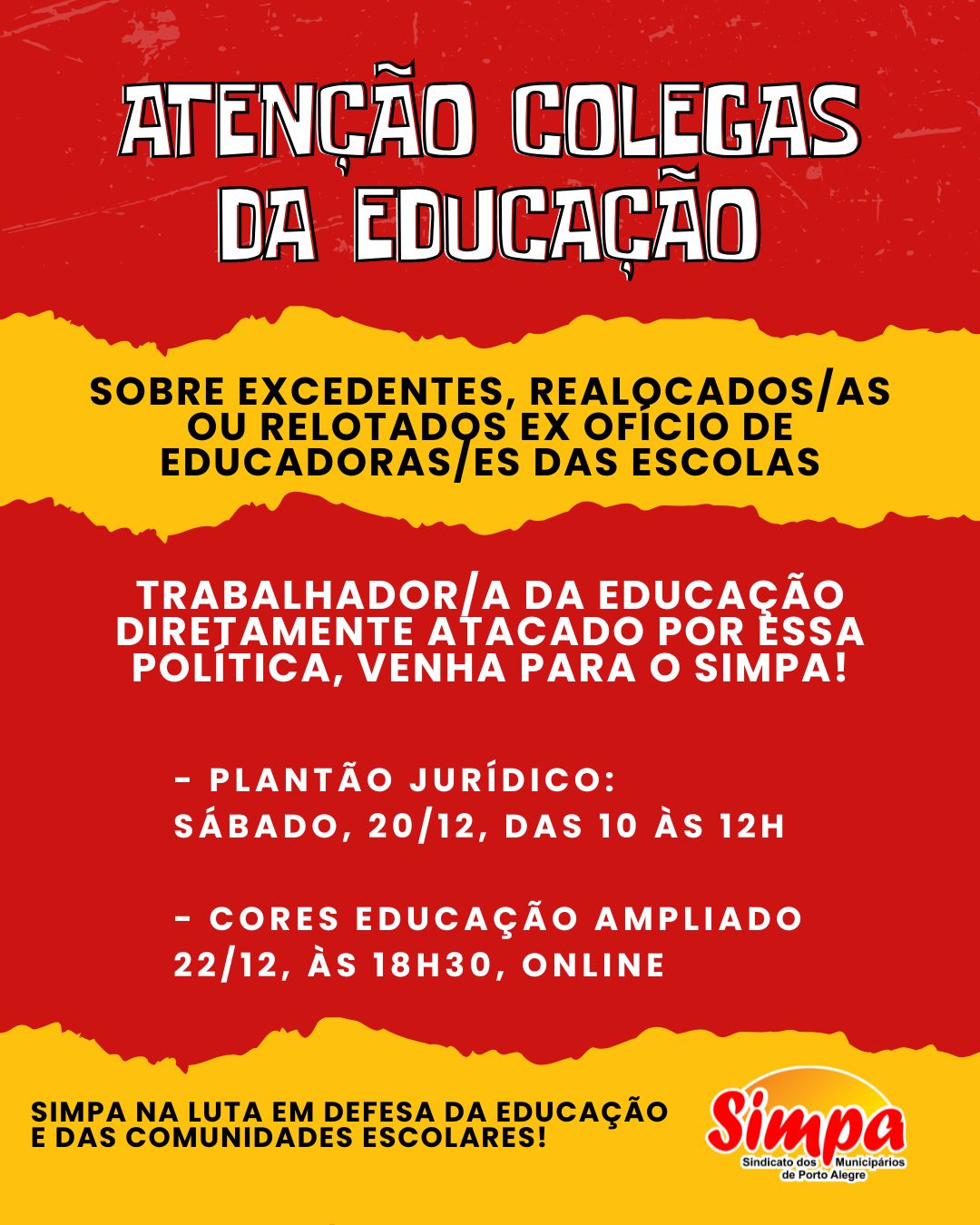 Pascoal fecha o ano com um cenário de terror. Desorganiza as comunidades escolares retirando centenas de professores/as e monitores/as de maneira abrupta e autoritária, causando adoecimento e insegurança. Trabalhador/a da educação diretamente atacado por essa política, venha para o SIMPA Plantão jurídico – sábado, dia 20/12, das 10 às 12h CORES educação ampliado – dia […]