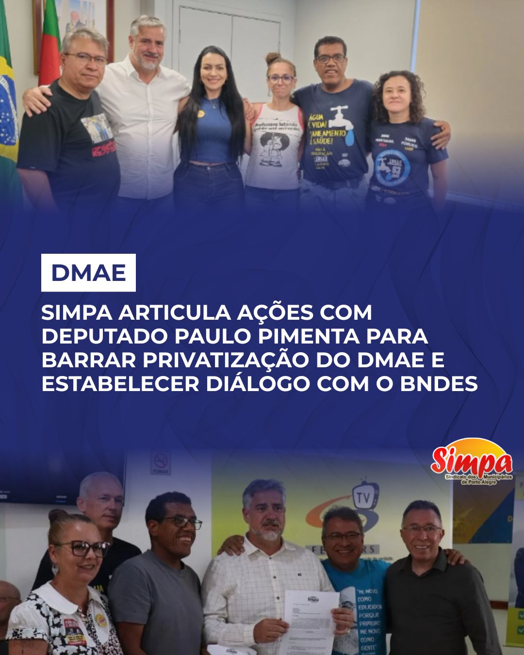 Na manhã desta quinta-feira (18/12), a nova direção do Sindicato dos Municipários de Porto Alegre (Simpa) participou de um encontro com o deputado federal Paulo Pimenta (PT/RS), que teve como principal objetivo ampliar ações para barrar o projeto de privatização do Departamento Municipal de Água e Esgotos (DMAE) e a construção de um canal de […]