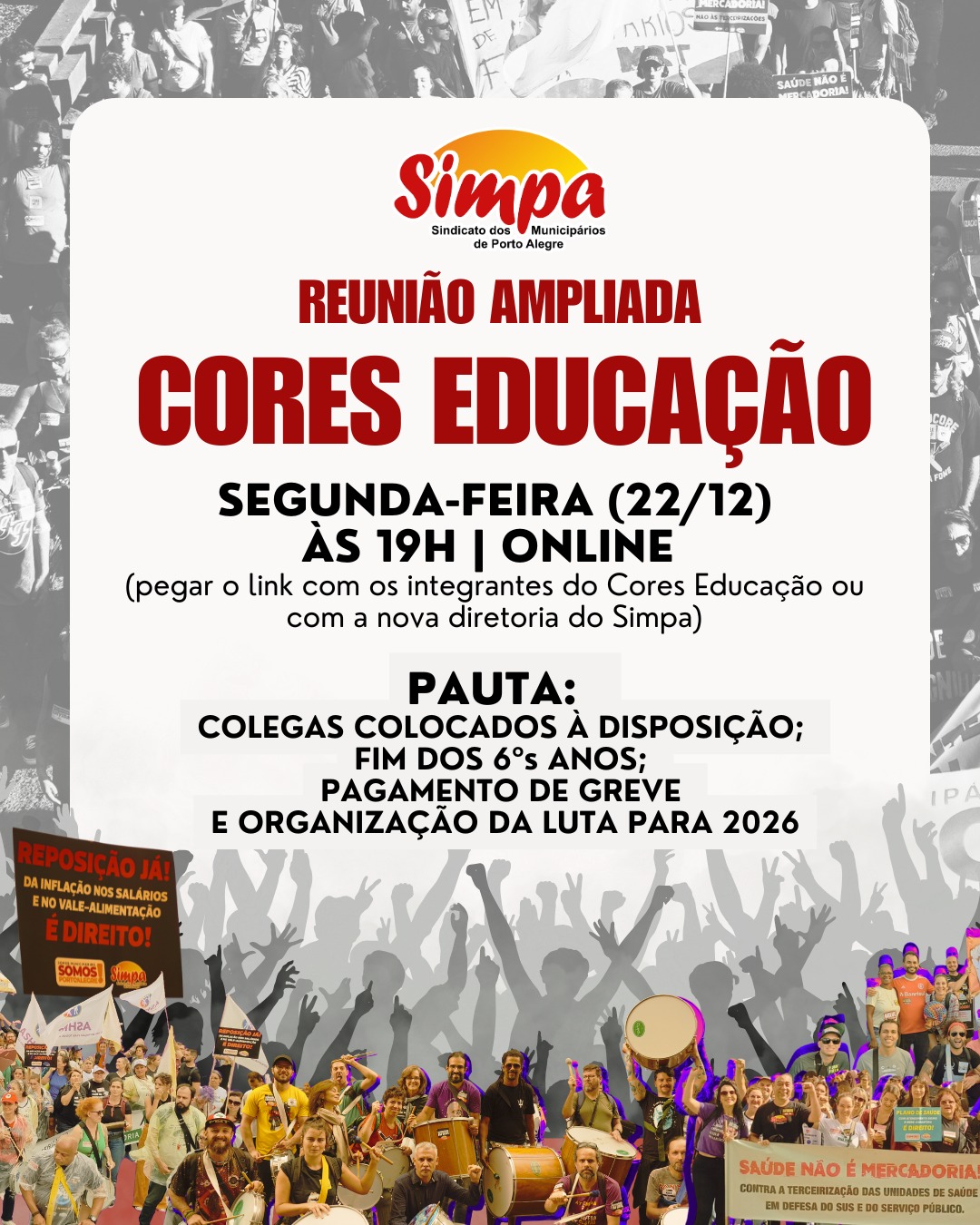 O CORES Educação convoca educadoras e educadores para a Reunião Ampliada, para discutir as principais pautas da categoria e organização e construção coletiva da luta. Segunda-feira | 22/12 |19h | Reunião online Pauta: • Colegas colocados à disposição • Fim dos 6ºs anos • Pagamento da greve • Organização da luta para 2026 […]