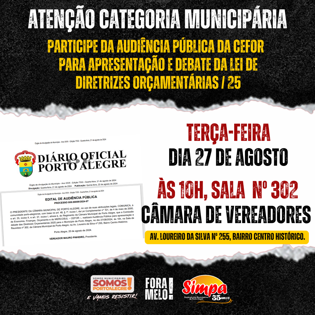 O Sindicato dos Municipários de Porto Alegre (Simpa) convoca a categoria para participar da Audiência Pública sobre a Lei de Diretrizes Orçamentárias (LDO/2025), promovida pela Comissão de Economia, Finanças, Orçamento e do MERCOSUL (CEFOR) da Câmara Municipal de Porto Alegre, que será realizada às 10h da próxima terça-feira (27/8), na Sala de Reuniões nº 302 […]