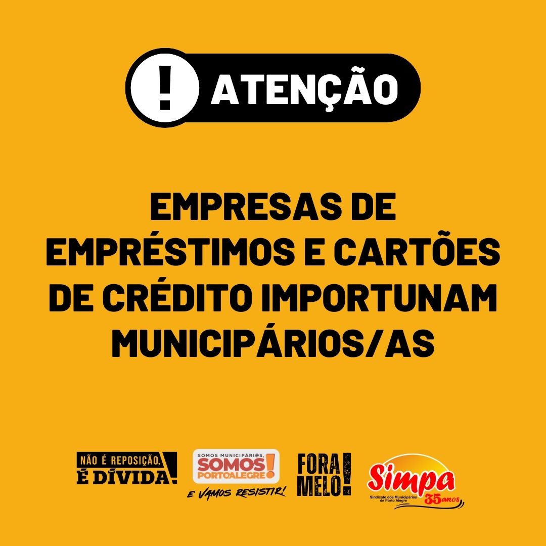 Os diretores do Sindicato dos Municipários de Porto Alegre – Simpa, Assis Olegário e Bete Charão, durante reunião na Secretaria de Administração de Patrimônio – SMAP sobre outro tema, foram informados pelo secretário adjunto Richard Dias, do recebimento de diversas notificações de empresas financeiras oferecendo cartões de crédito e empréstimos com pagamento consignado aos servidores […]