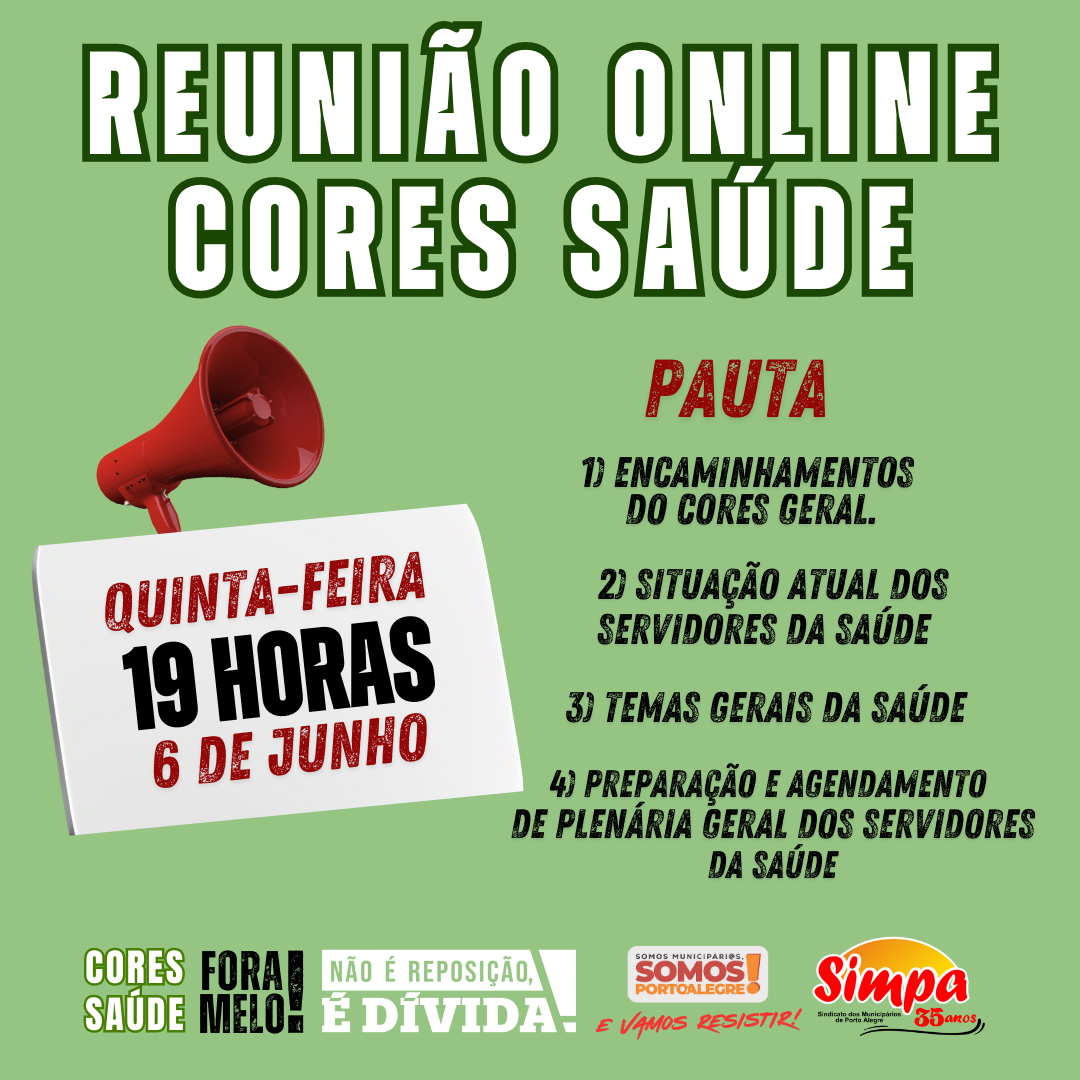 Na quinta-feira, dia 6 de junho, o Cores Saúde promove Reunião online, a partir das 19 horas. PAUTA: 1) Encaminhamentos do Cores Geral 2) Situação atual dos Servidores da Saúde 3) Temas Gerais da Saúde 4) Preparação e agendamento de Plenária Geral dos Servidores da Saúde Contamos com a presença de tod@s!!! Somos municipári@s, somos […]