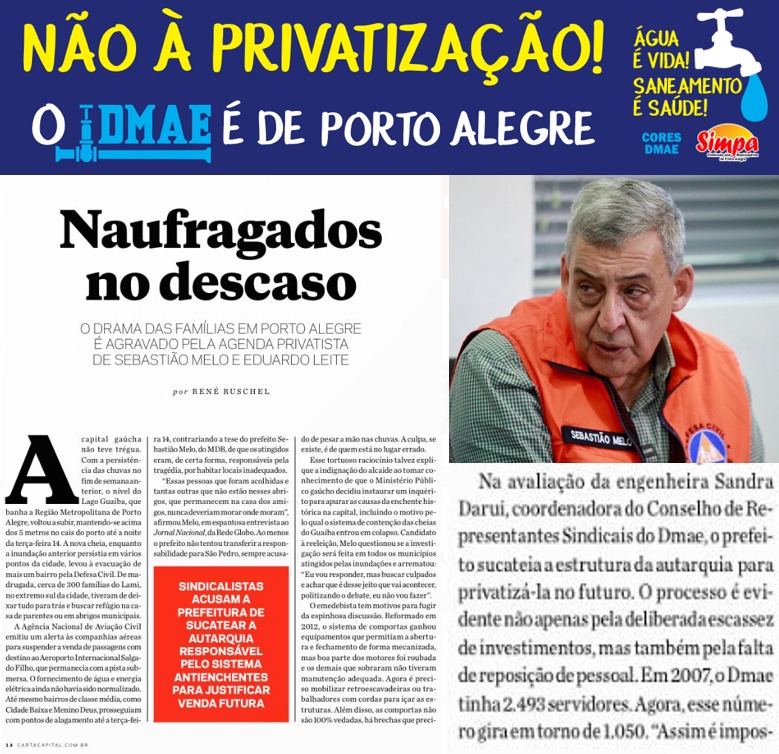 “O drama das famílias em Porto Alegre é agravado pela agenda privatista de Sebastião Melo e Eduardo Leite!” Leia a reportagem completa na matéria da CARTA CAPITAL: https://leiaisso.net/vy7t1/ Seguimos na luta contra a privatização! O DMAE público está fazendo a diferença nesta hora tão difícil! Colegas vistam a camiseta com orgulho!! Decisivo […]