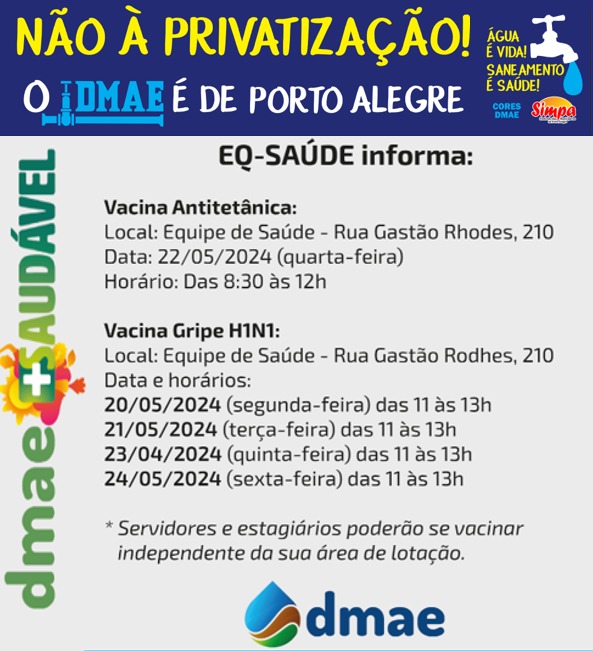 Em parceria com a SMS – Vigilância em Saúde/Centro de Referência em Saúde do Trabalhador a Equipe de Saúde estará novamente disponibilizando a Vacina Antitetânica aos Servidores do Departamento que estão trabalhando na linha de frente. Aplicação da Vacina Antitetânica: LOCAL: Equipe de Saúde – Rua Gastão Rodhes, 210 DATA: 22/05/2024 – Quarta – […]