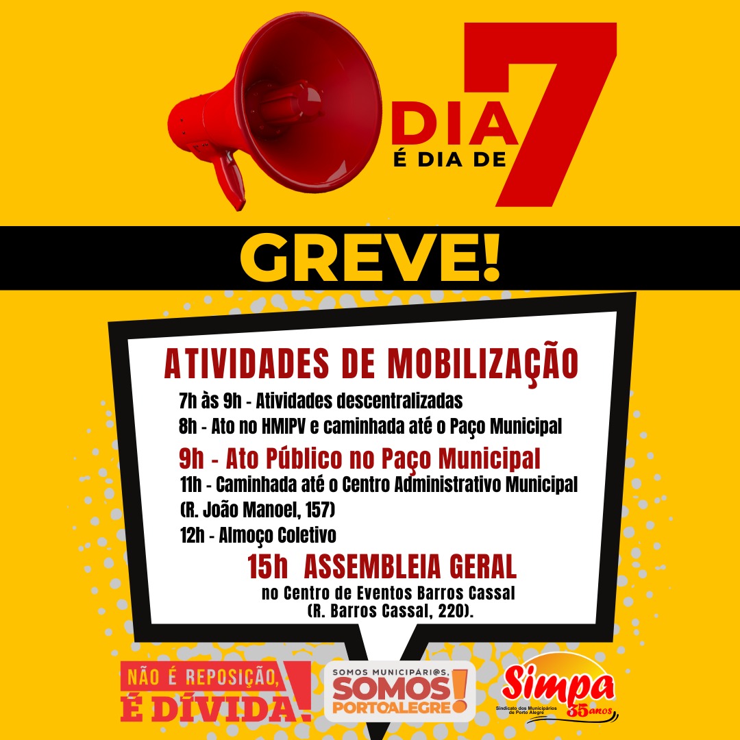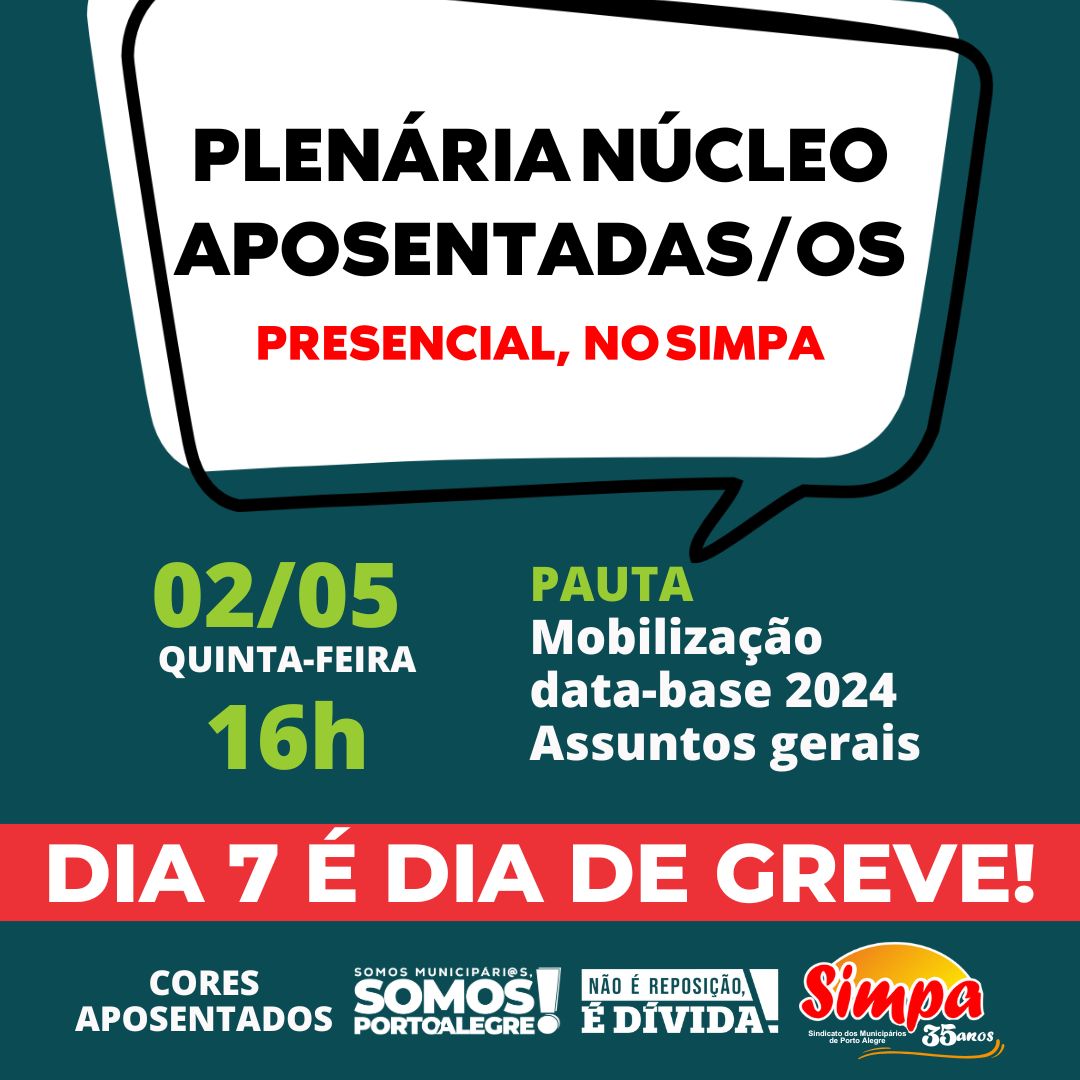 📍 Dia 02/5 [quinta-feira], às 16h, PRESENCIAL no Simpa. ⬇️ PAUTA: – Mobilização data-base 2024; – Assuntos gerais. ⚠️ DIA 7 É DIA DE GREVE‼️ Somos Municipári@s, Somos Porto Alegre❗ Não é reposição, É DÍVIDA❗ #DATABASE2024 #SimpaSindicato