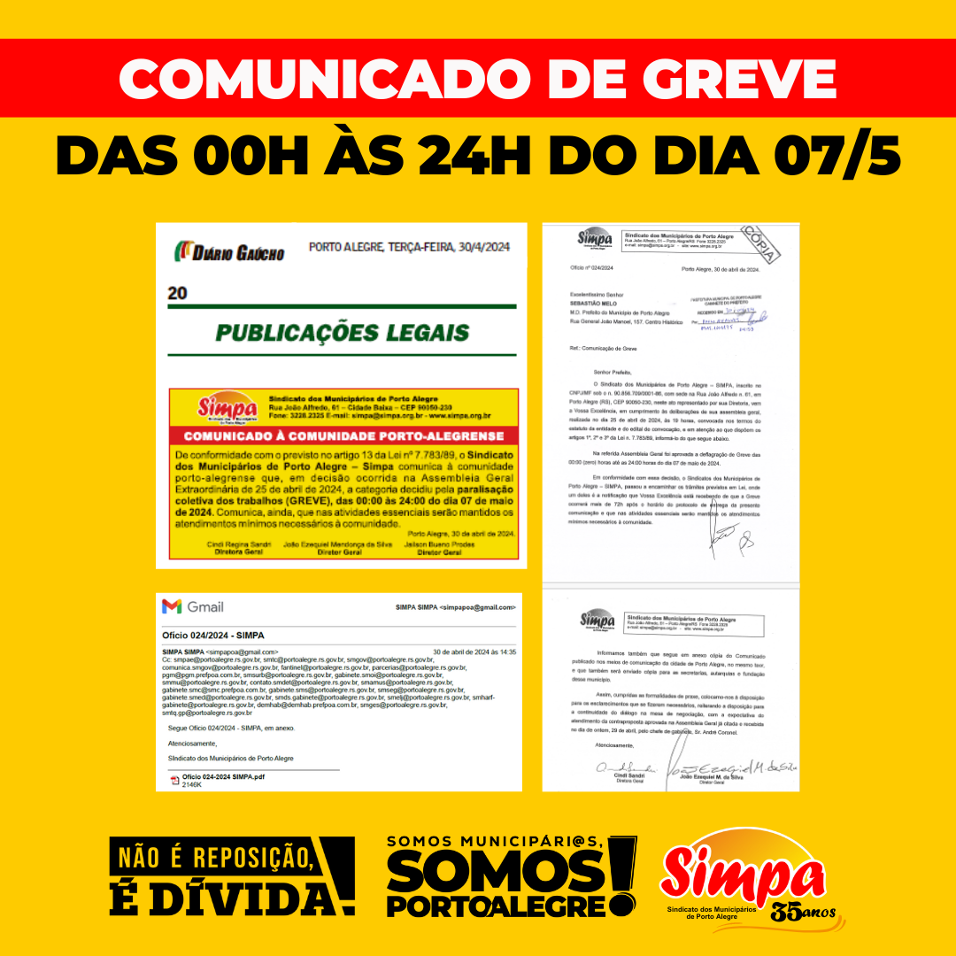 O Sindicato dos Municipários de Porto Alegre (Simpa), em cumprimento às deliberações da Assembleia Geral do último dia 25 de abril, protocolou Comunicado de Greve para conhecimento do prefeito, Sebastião Melo. O documento informa a deflagração de Greve das 00:00 (zero) horas até as 24:00 horas do dia 07 de maio de 2024 e também […]