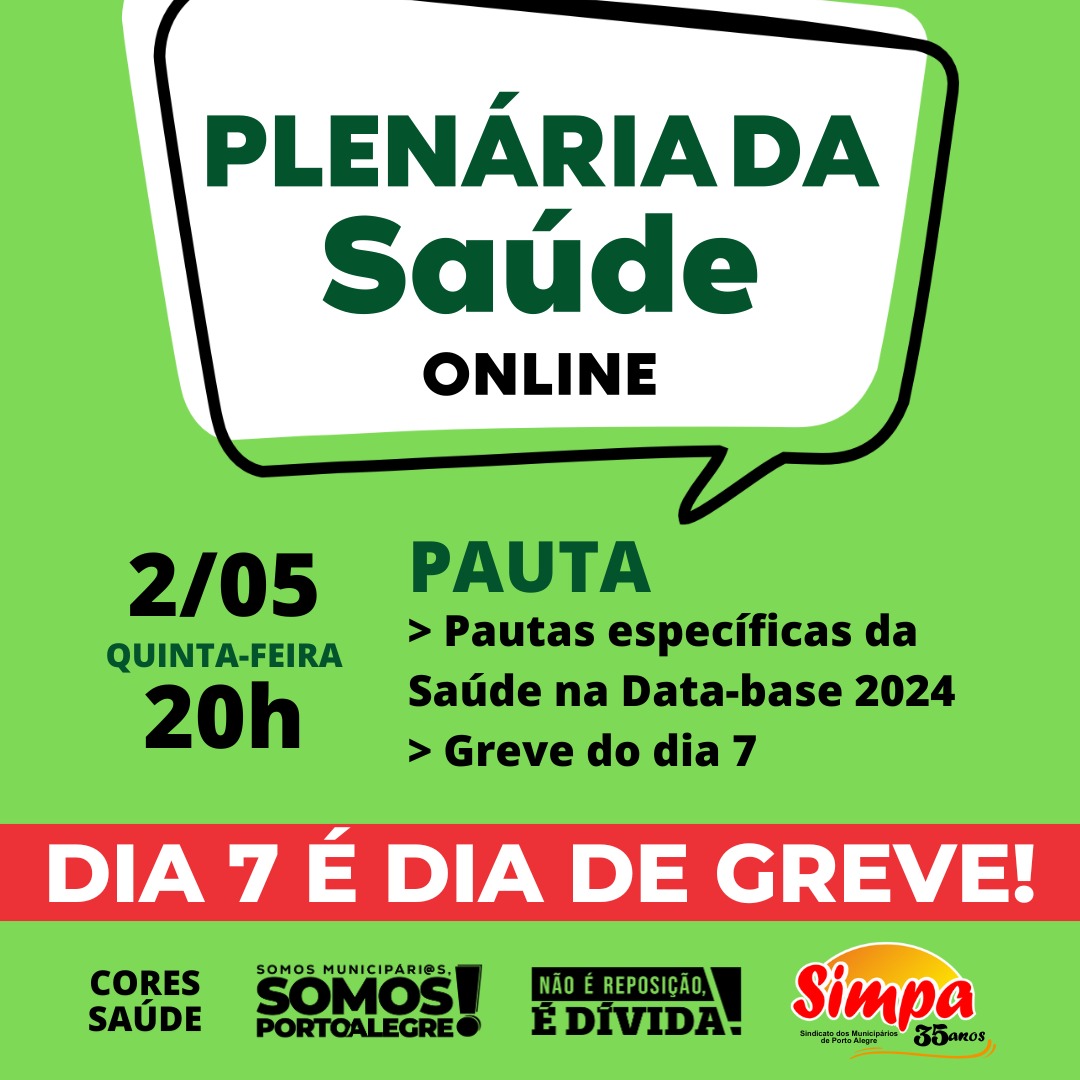 Na próxima quinta-feira, dia 02/05, às 20h vamos nos encontrar online pelo Google Meet para a nossa plenária de organização e mobilização sobre a GREVE do dia 7 de maio e as pautas específicas da Saúde na Data-base 2024: ▪️ Piso da Enfermagem (retroativos) ▪️ Luta dos Agentes (INSS, CTPS, IFA e GIQ) ▪️ Convocação […]