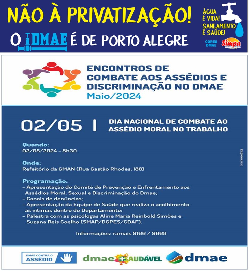 O SIMPA e o CORES DMAE fazem parte do Comitê de Prevenção e Enfrentamento ao Assédio Moral, Sexual e Discriminação do DMAE e convida a todxs no DMAE para participar da atividade do DIA NACIONAL DE COMBATE AO ASSÉDIO MORAL NO TRABALHO: “ENCONTROS DE COMBATE AOS ASSÉDIOS E DISCRIMINAÇÃO NO DMAE” QUANDO: 02/05/2024 – 8h30 […]