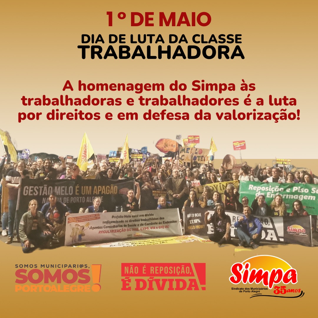 A homenagem do Simpa às trabalhadoras e trabalhadores é a luta por direitos e em defesa da valorização! 📢 DIA 7 É DIA DE GREVE❗ Somos Municipári@s, Somos Porto Alegre❗ Não é reposição, é dívida❗ #DATABASE2024 #SimpaSindicato