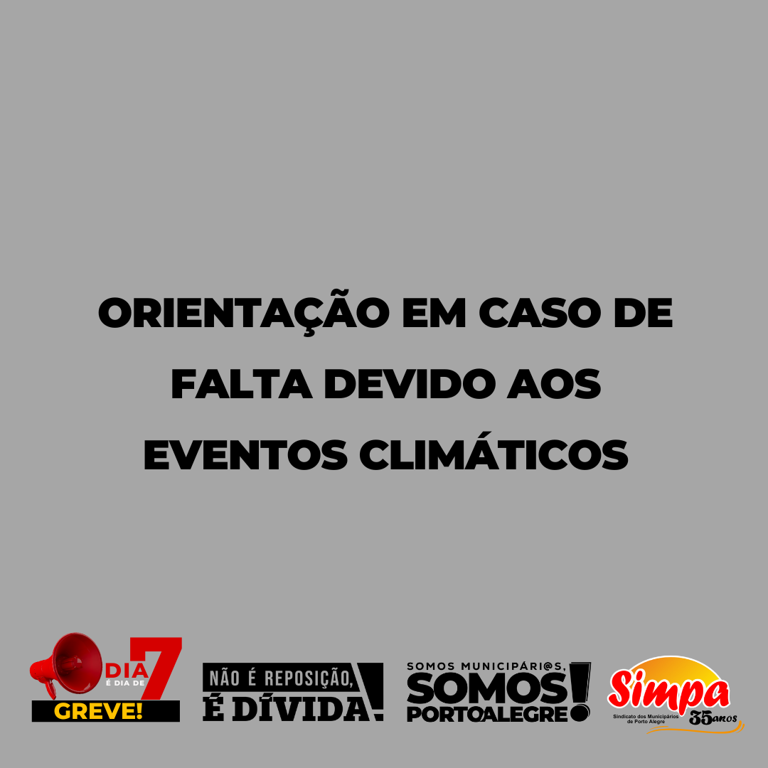 A assessoria jurídica contratada do Simpa, Kauer Villar & Advogados Associados, emitiu orientação reforçando os procedimentos que devem ser seguidos por servidoras e servidores impedidos de comparecer ao trabalho devido aos eventos climáticos. “Não podendo, a trabalhadora ou o trabalhador, dos setores público ou privado, comparecer ao local de trabalho, deve essa ou esse imediatamente […]