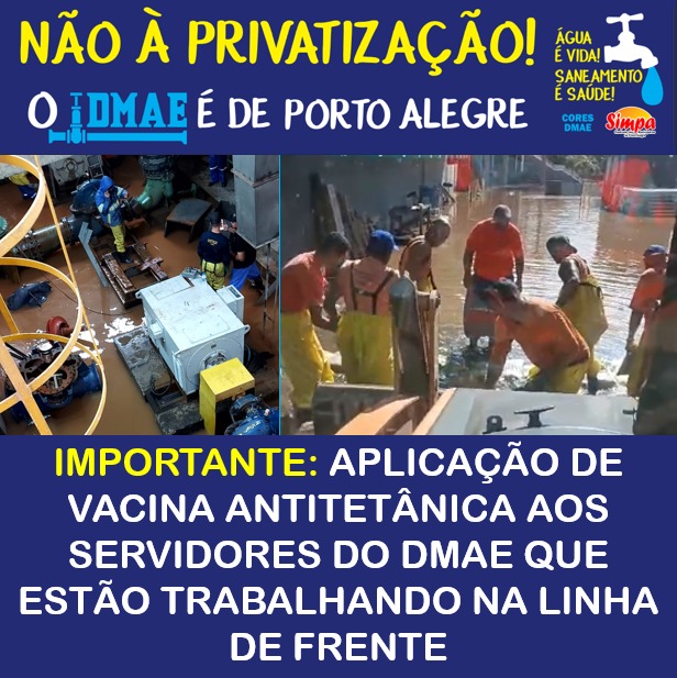 A vacinação é recomendada aos servidores que estão em contato com as águas contaminadas e/ou tenham risco de cortes ou machucados em função das atividades que estão submetidos. A Equipe de Saúde do DMAE estará disponibilizando a Vacina Antitetânica aos Servidores do Departamento que estão trabalhando na linha de frente. LOCAL: Equipe de Saúde – […]