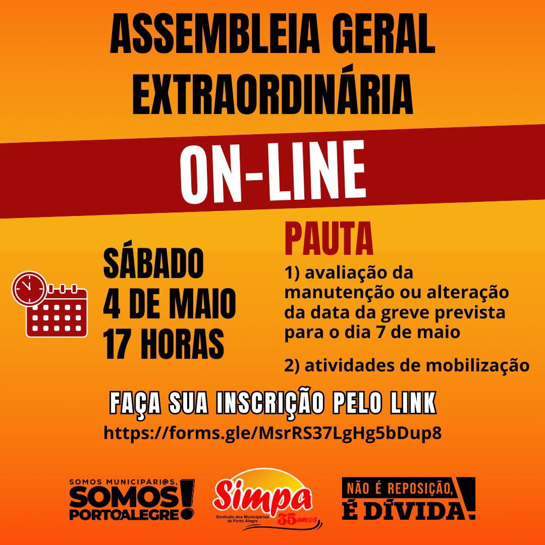 Em função da grave crise climática e do estado de calamidade que atinge Porto Alegre, a direção do Sindicato dos Municipários de Porto Alegre (Simpa) convoca uma Assembleia Geral Extraordinária, no formato on-line, com a seguinte pauta: 1) AVALIAÇÃO DA MANUTENÇÃO OU ALTERAÇÃO DA DATA DA GREVE PREVISTA PARA O DIA 7 DE MAIO 2) […]