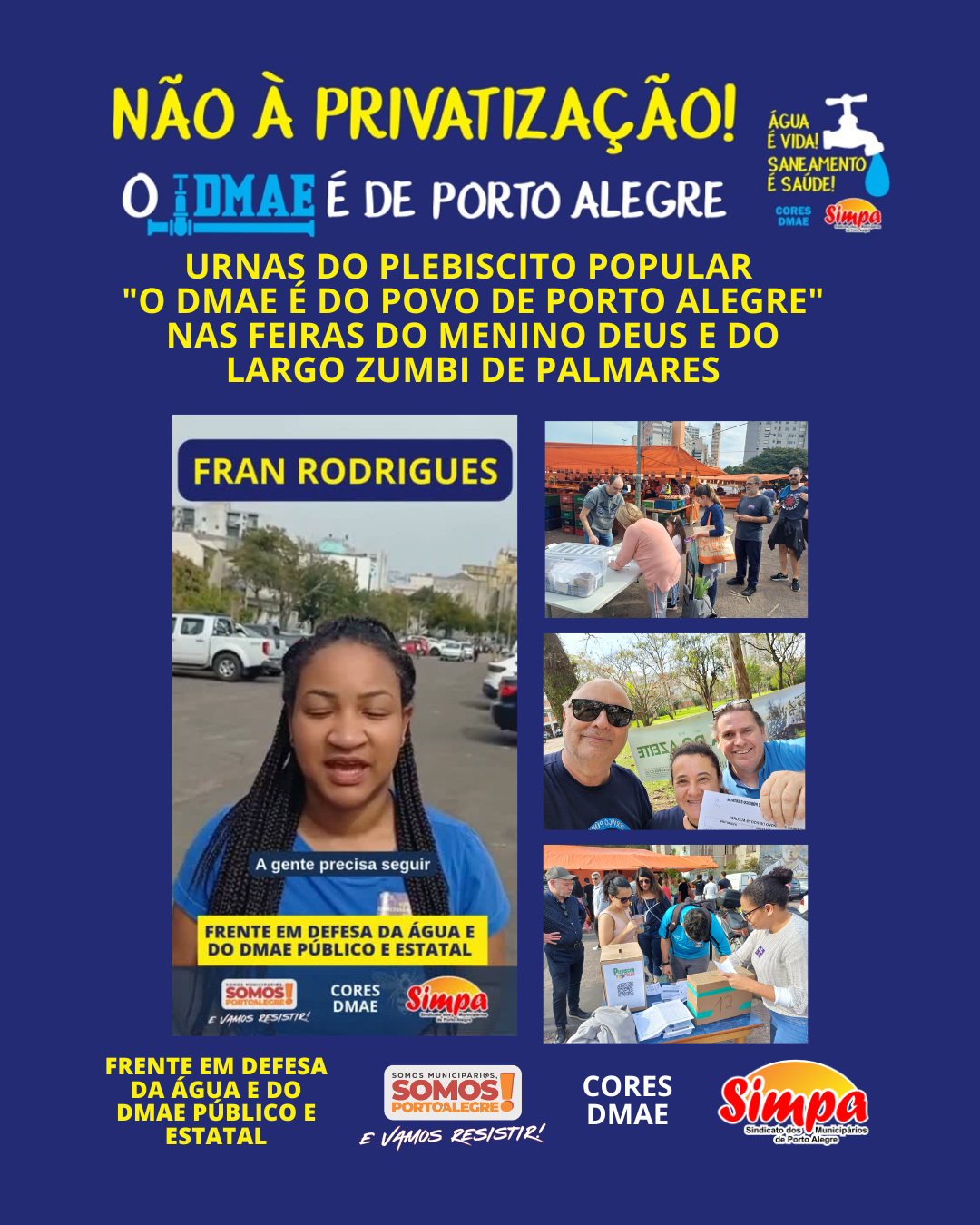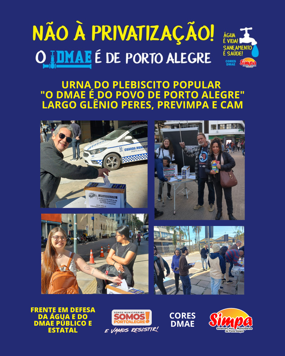 GALERIA DE FOTOS DAS URNAS NO GLÊNIO PERES, PREVIMPA E CAM https://x.gd/3rwon VOTE ON-LINE PELO LINK ABAIXO: https://simpa.org.br/plebiscitodmae/ Durante esta semana, a urna do Plebiscito Popular “O DMAE é do Povo de Porto Alegre” esteve em diferentes pontos da cidade. Na quarta-feira à tarde, esteve no Largo Glênio Peres, junto com o evento “Esperançar”. Na […]