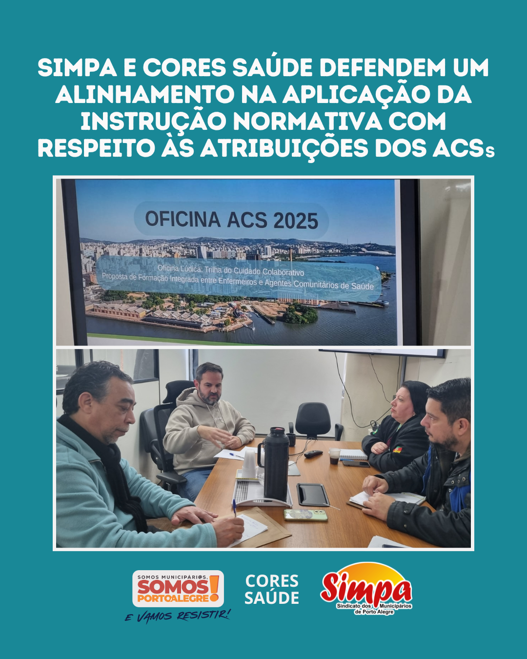 O Sindicato dos Municipários de Porto Alegre (Simpa), representado pelo diretor João Ezequiel, e os integrantes do Cores Saúde, Israel Calábria e Mariana Perachi, reuniram-se na última quinta-feira (31/07) com o coordenador-geral do COENF, Leonardo, na Secretaria Municipal de Saúde (SMS), para discutir as capacitações sobre a nova Instrução Normativa nº 32761765/2025, referente aos Agentes […]