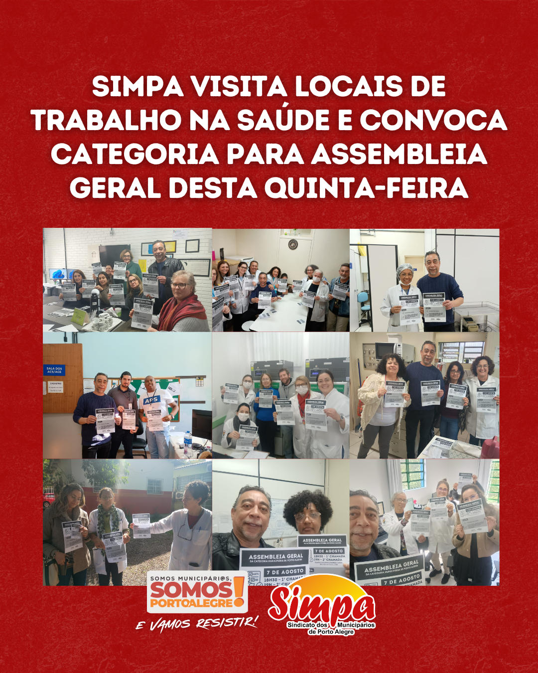 O Sindicato dos Municipários de Porto Alegre (Simpa) visitou diversos locais de trabalho da saúde nesta semana, reforçando o diálogo direto com a categoria e convocando para a Assembleia Geral que ocorre nesta quinta-feira, dia 7 de agosto. O Sindicato dos Municipários de Porto Alegre (Simpa) visitou diversos locais de trabalho da saúde municipal nesta […]