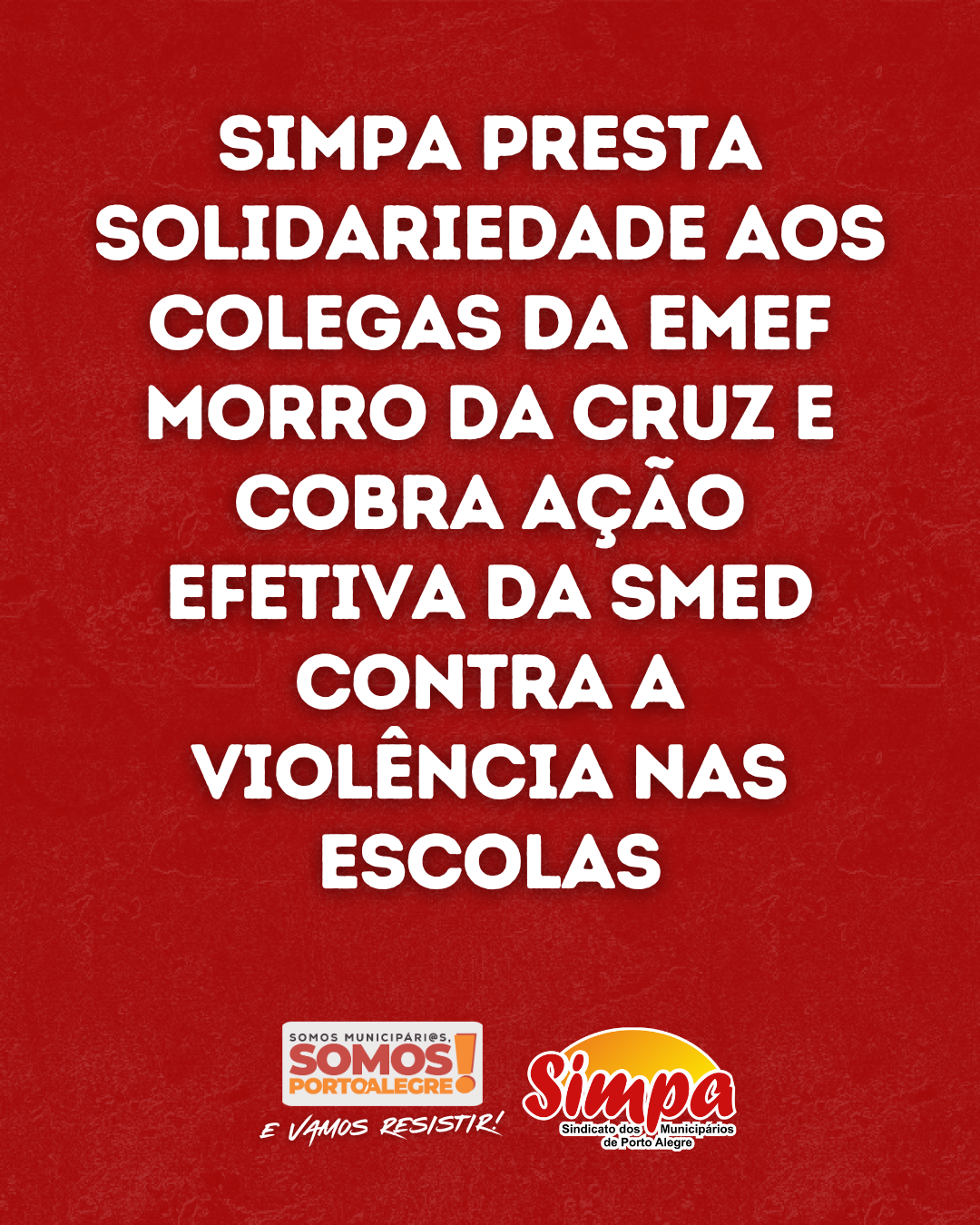 O Sindicato dos Municipários de Porto Alegre (Simpa) esteve, nesta quarta-feira (13), na EMEF Morro da Cruz, manifestando solidariedade à vice-diretora agredida e aos demais colegas. O Simpa reafirma que a violência escolar não é um caso isolado e exige que a SMED desenvolva ações efetivas de combate à violência nas escolas. Os diretores Bete […]