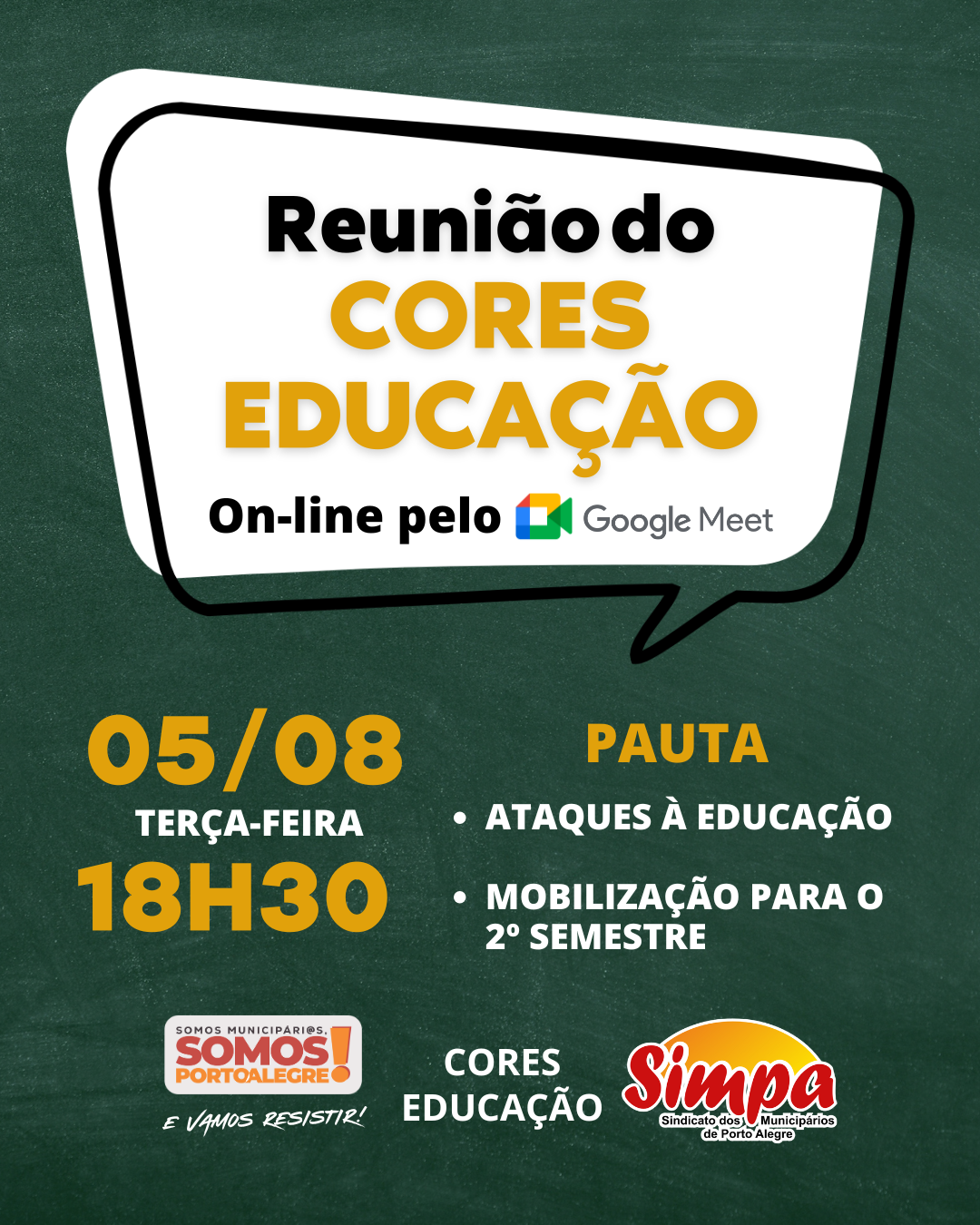 Dia 5/8 (terça-feira), às 18h30, através da plataforma Google Meet. O Cores Educação marca reunião, aberta para todos os trabalhadores e trabalhadoras da educação, para esta terça-feira (5/8), às 18h30, através da plataforma Google Meet. O link será disponibilizado no dia com a coordenação do Cores. A pauta da reunião tem 2 itens: Ataques à […]